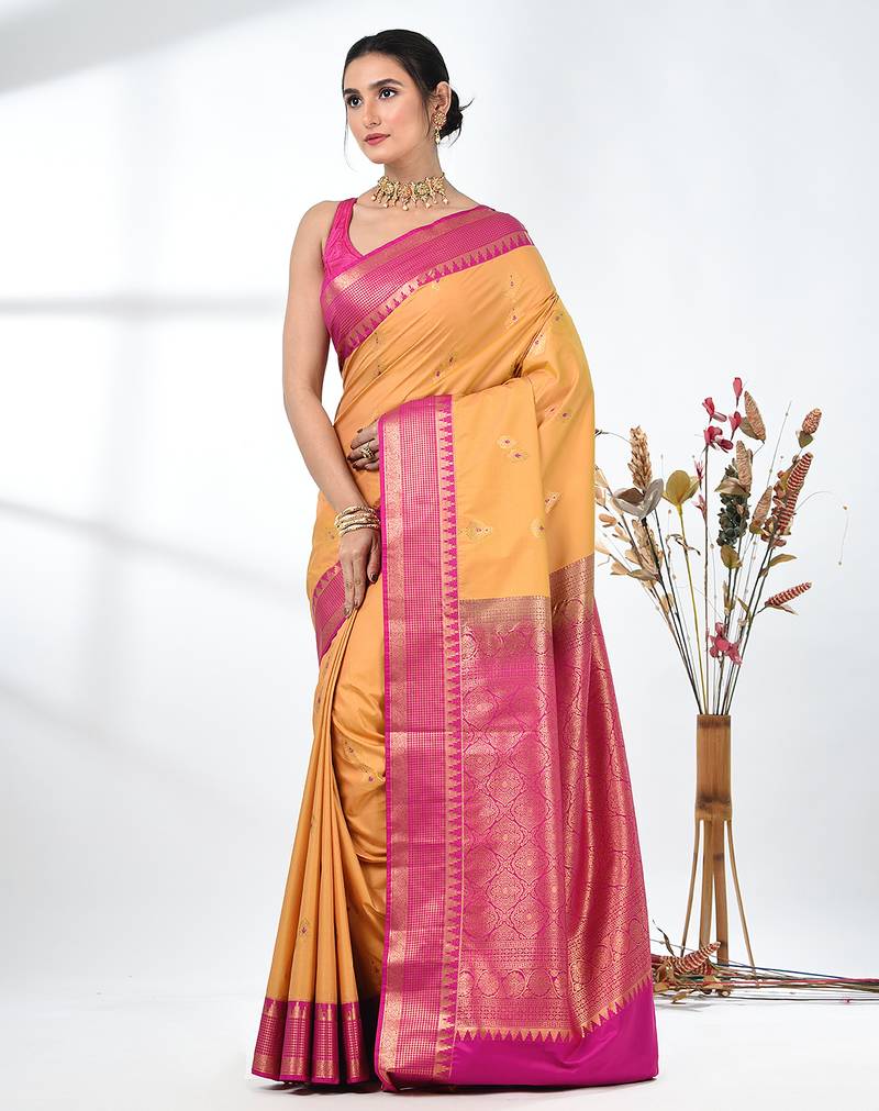 | Product Description | Embrace Timeless Elegance With This Exquisite Mustard Pure South Silk Saree. The Luxurious Fabric Offers A Soft And Radiant Drape, Enhancing The Grace Of The Wearer. The Saree Features Intricate Zari Work Throughout, With A Stunning Contrast Of Pink At The Border, Adding A Regal Touch. The Rich Golden Zari Motifs And Detailed Floral Designs In The Border Further Elevate Its Beauty, Making It The Perfect Choice For Weddings, Festivals, And Special Occasions. The Fine Quality South Silk Fabric Ensures Comfort And Sophistication, While The Bold Color Combination Creates A Striking And Elegant Look. Pair It With Traditional Jewelry And A Sleek Blouse To Complete Your Festive Look. |