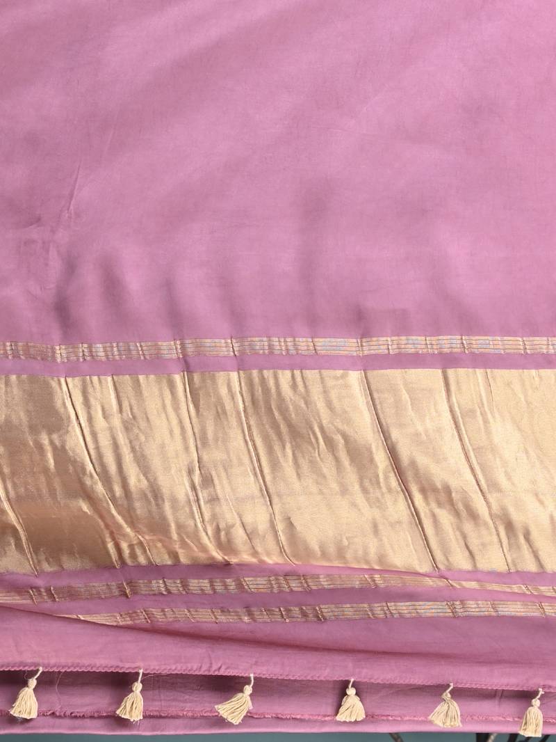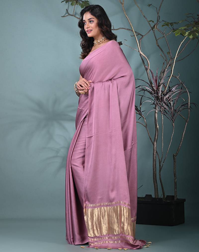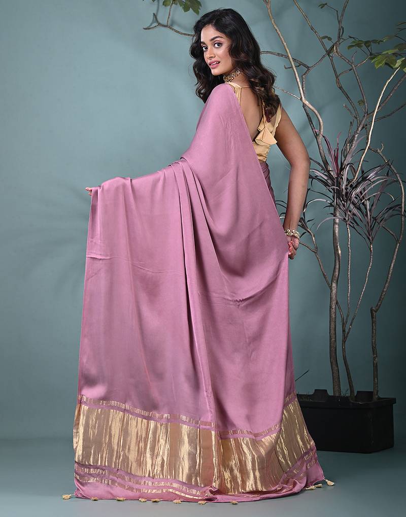 Mauve modal silk blend saree with golden border and tassels