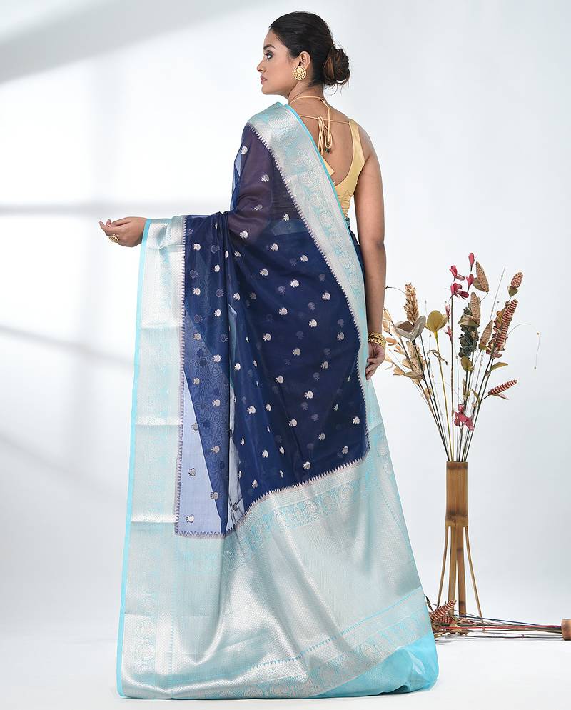 | Product Name | Navy Blue Organza Saree With Floral Motifs And Light Blue Border | |