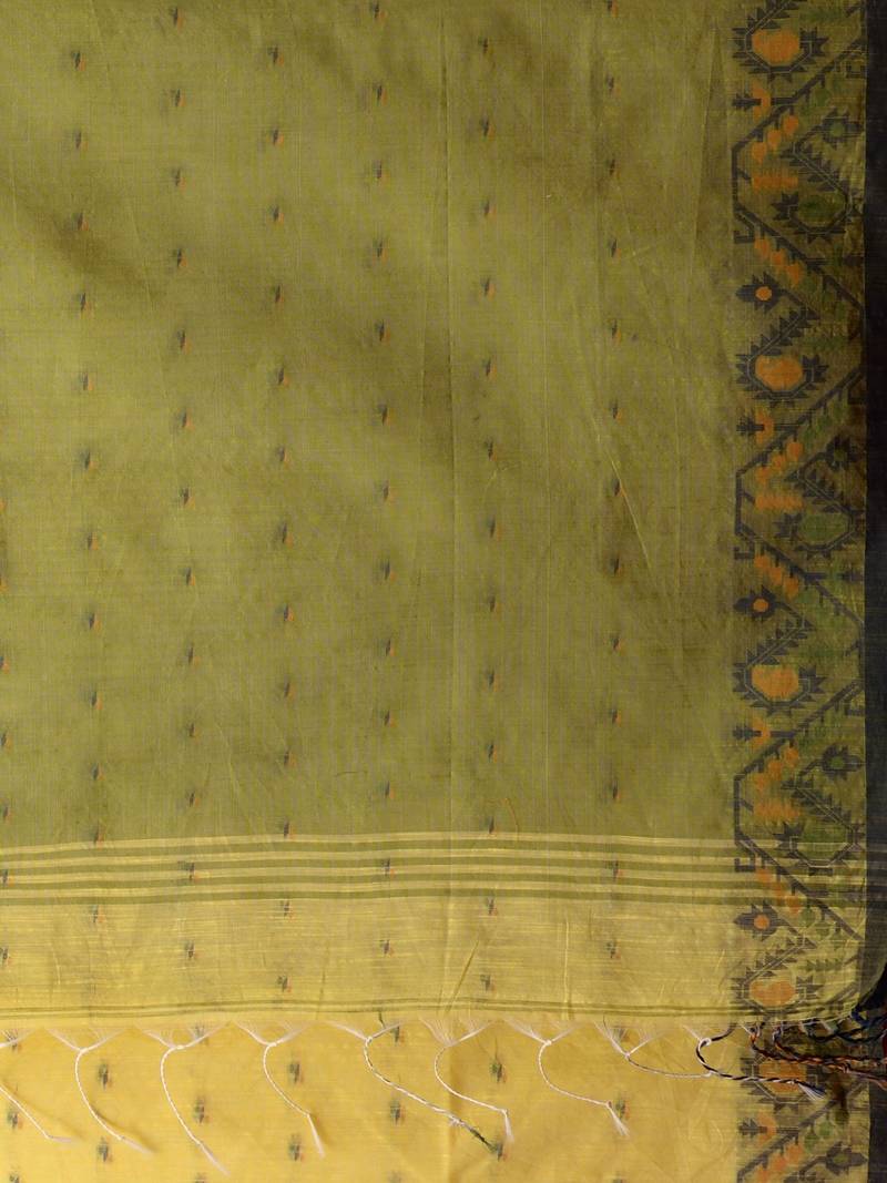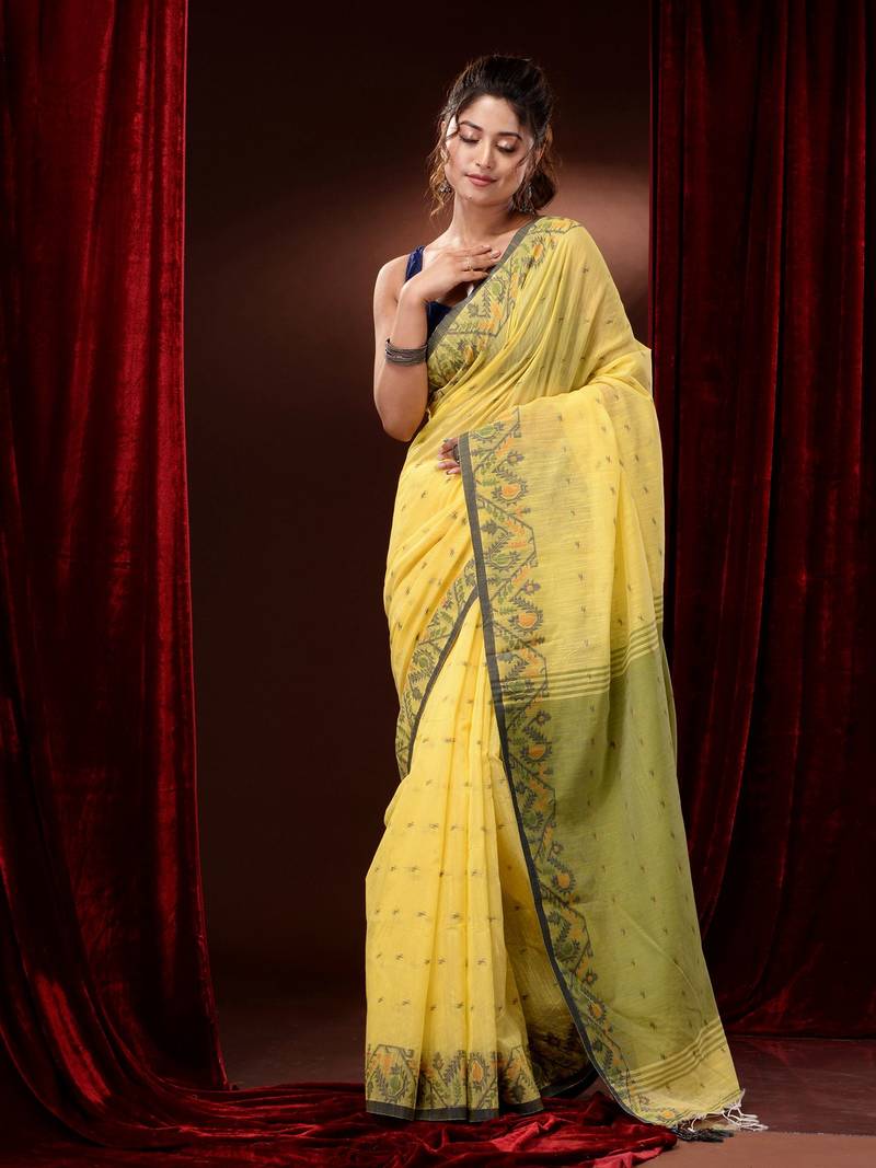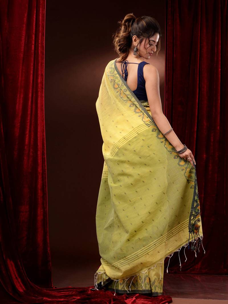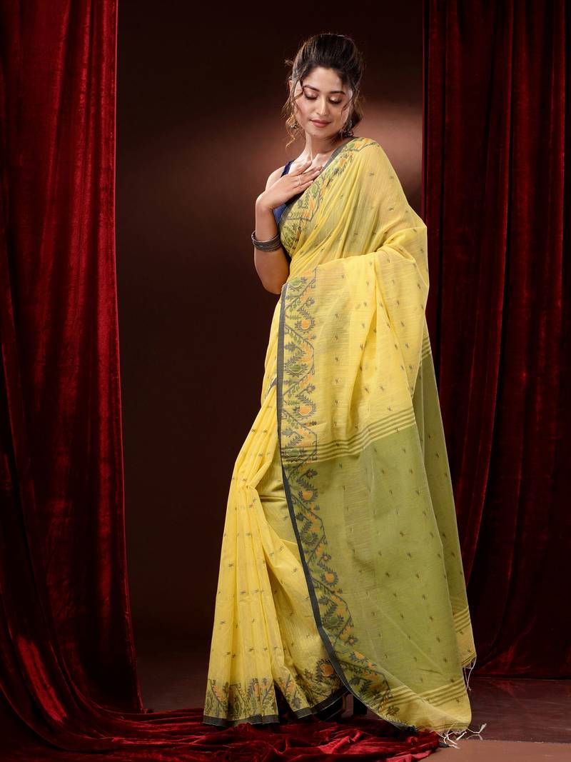 | Product Description | Get A Classic Colour Combination In This Yellow Cotton Handspun Saree. It Has Small Ethnic Motifs Woven All Over And The Borders Have Jamdani Designs. The Pallu Is In Green For A Complete Look. |
