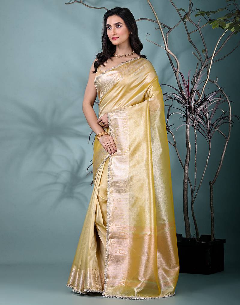 | Product Name | Yellow Tissue Saree With Intricate Silver Zari Border | |