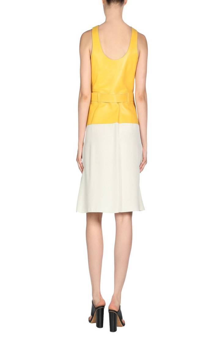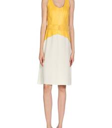 | Product Description | Women’s Colorblock Lambskin Leather Sleeveless A Line Dress With Belted Waist Stylish Yellow & Beige Colorblock Design