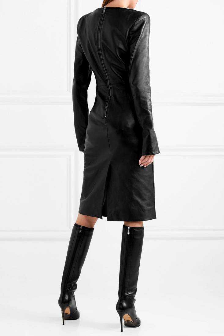 | Product Name | Women’s Genuine Black Lambskin Leather Long Sleeve Midi Dress With V Neck | |