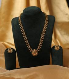 | Product Description | Adorn Yourself With The Grandeur Of This Long Antique Gold Plated Haram. The Necklace Features A Dual Row Design Studded With High Quality Emerald Green Stones, Leading To An Ornate Circular Pendant With Intricate Floral Detailing. Perfect For Layering Over Sarees, This Regal Set Comes With Matching Circular Stud Earrings For A Complete Traditional Ensemble. |
