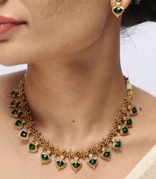 | Product Description | Enhance Your Ethnic Collection With This Exquisite Antique Gold Toned Necklace Set. The Design Features A Graceful Fringe Of Spade Shaped Motifs, Each Inlaid With A Deep Emerald Green Stone. Paired With Matching Stud Earrings, This Handcrafted Set Offers A Sophisticated Pop Of Color, Making It An Ideal Choice For Weddings And Traditional Festivals. |