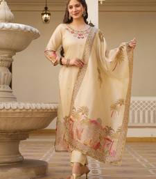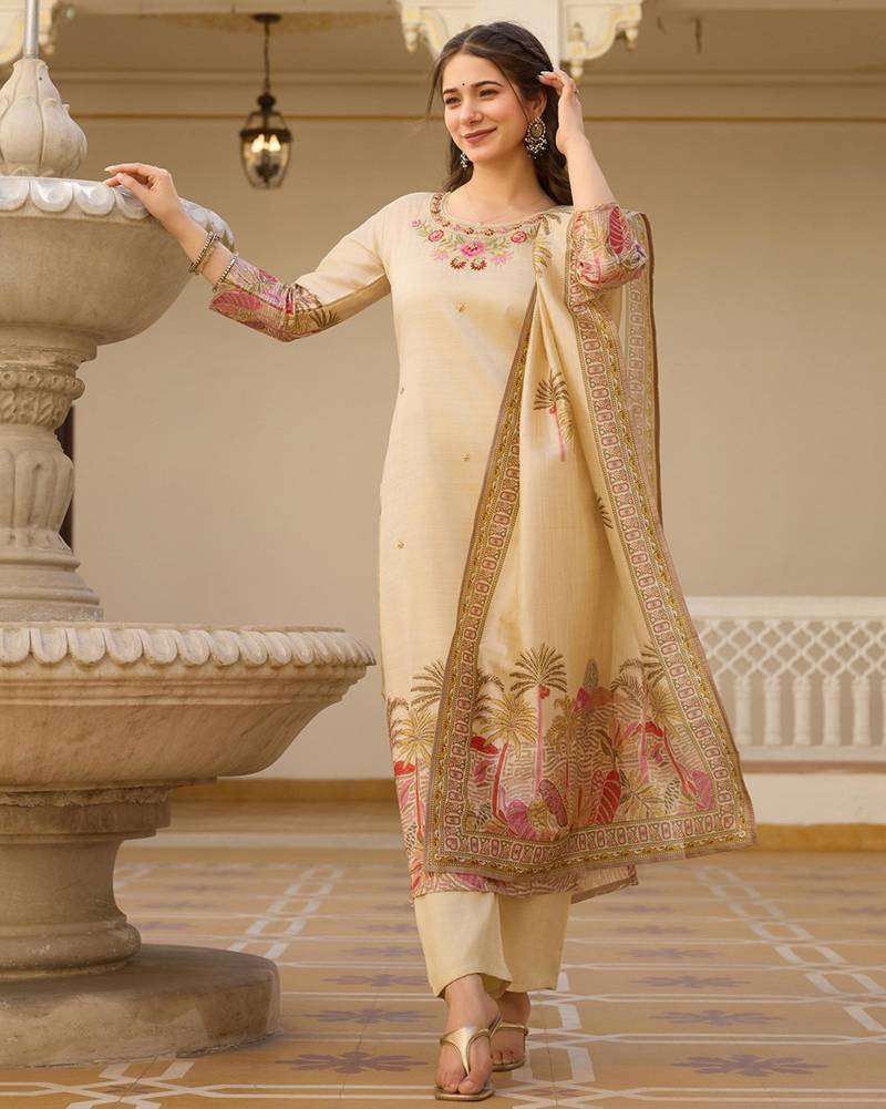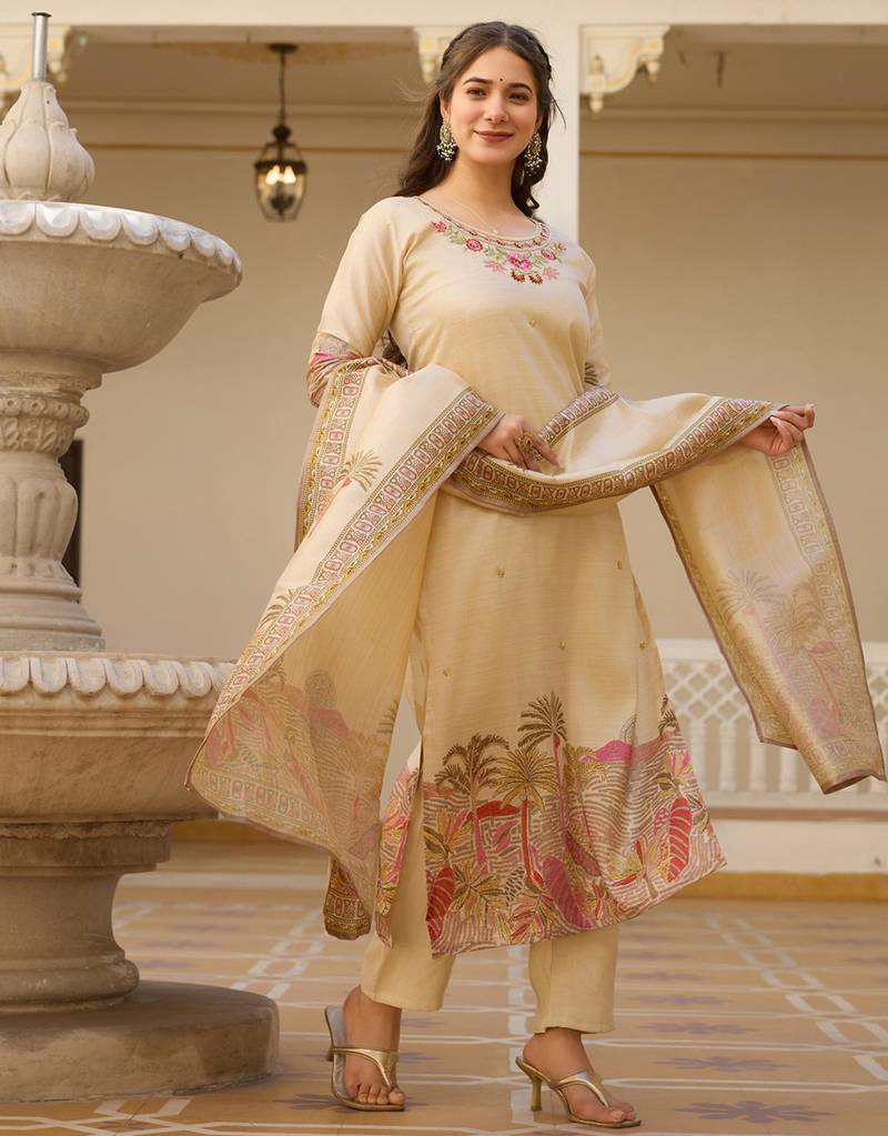 | Product Description | This Elegant Beige Ensemble Captures A Unique Charm With Its Sophisticated Landscape Inspired Illustrations. The Kurta Features Subtle Floral Embroidery At The Neckline, While The Dupatta Showcases A Beautiful Palm And Scenery Motif. Crafted From A Premium Cotton Silk Blend, This Breathable Yet Luxurious Set Is Ideal For Garden Parties And Daytime Celebrations. |