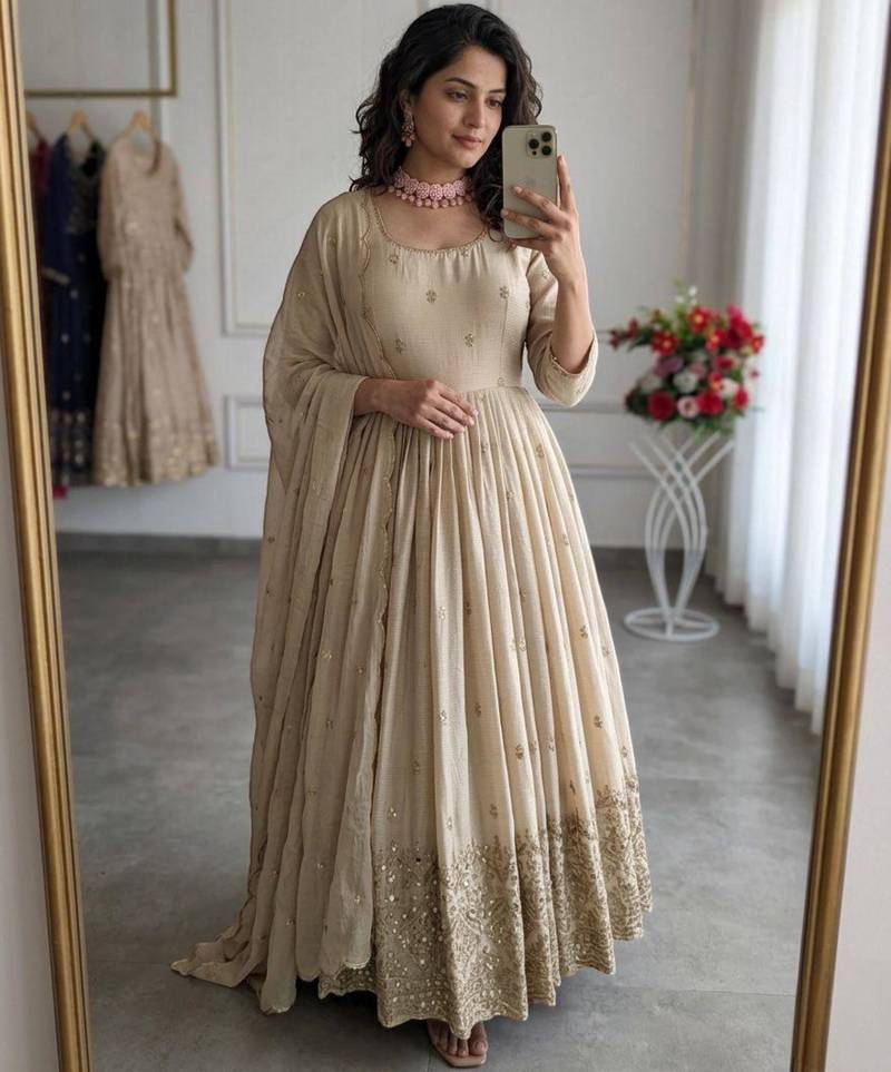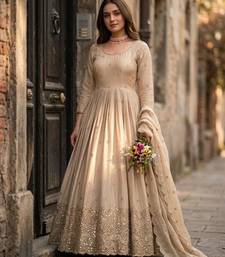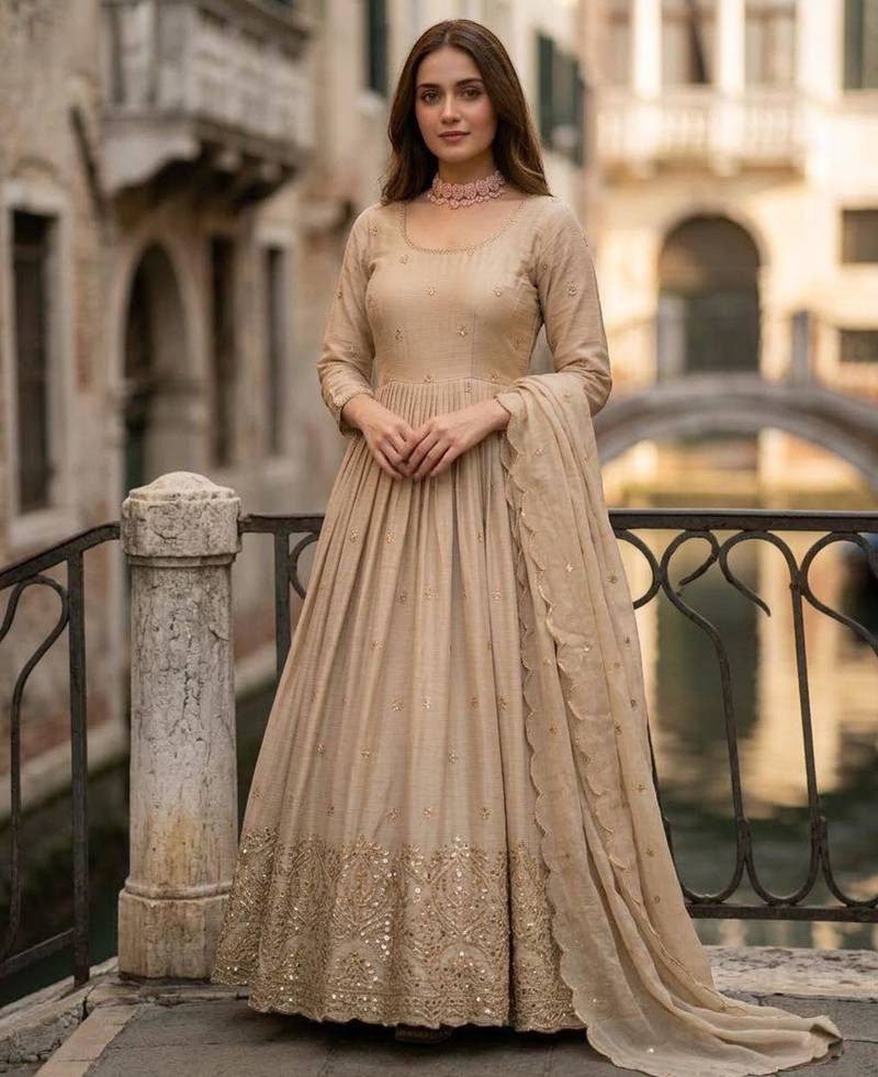 | Product Description | This Beige Sand Anarkali Gown Offers A Timeless, Neutral Aesthetic. The Bodice And Hem Are Detailed With Delicate Gold Threadwork And Shimmering Sequins. Featuring A Beautifully Scalloped Border And Matching Dupatta, This Silk Blend Ensemble Is A Sophisticated Choice For Engagement Parties And High Profile Ethnic Events. |