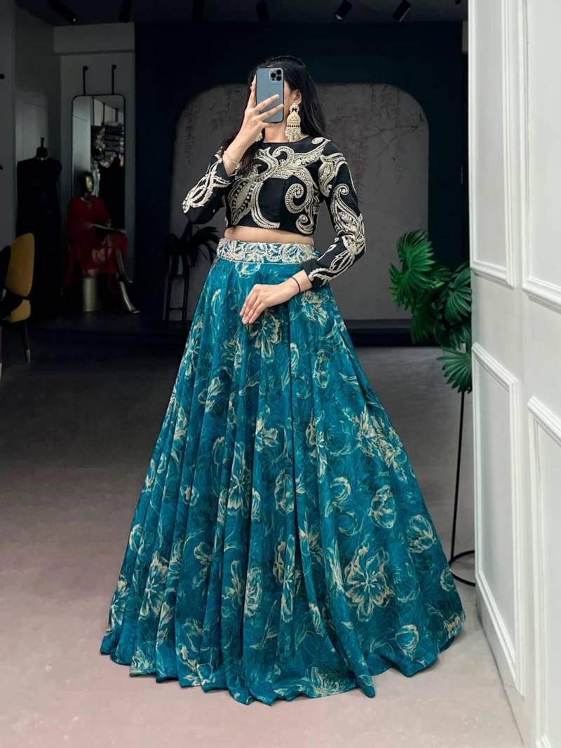 | Product Description | This Designer Lehenga Set Features A Bold Black Embroidered Blouse Paired With A Teal Floral Skirt. Crafted With High Quality Fabric, It Offers Both Comfort And Elegance. Perfect For Evening Events And Celebrations, This Outfit Delivers A Striking Fusion Of Modern Design And Traditional Detailing. |