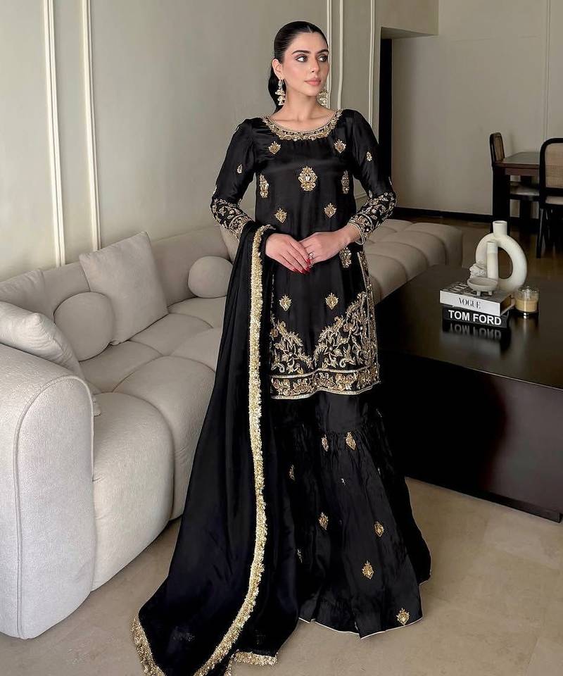 | Product Description | Make A Bold Statement In This Black Embroidered Suit Featuring Rich Gold Thread Detailing. Designed With A Classic Kurta, Comfortable Palazzo Pants, And A Matching Dupatta, This Outfit Offers A Perfect Blend Of Luxury And Style. Ideal For Evening Events, Parties, And Festive Gatherings With A Refined Finish. |