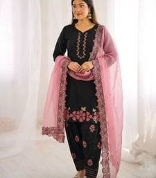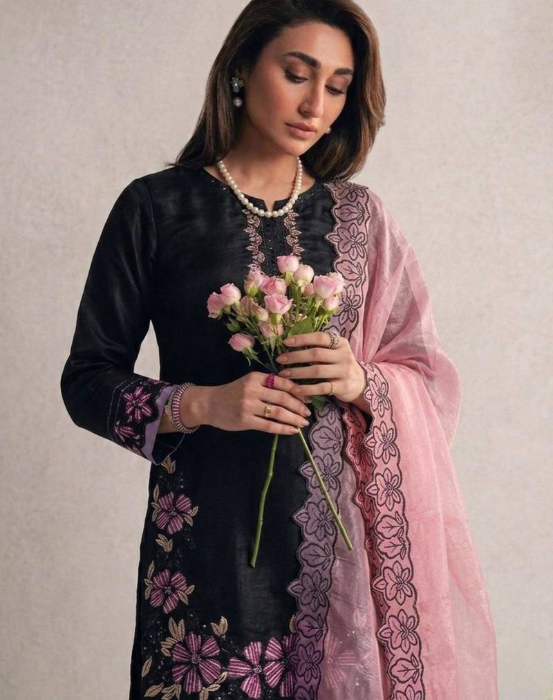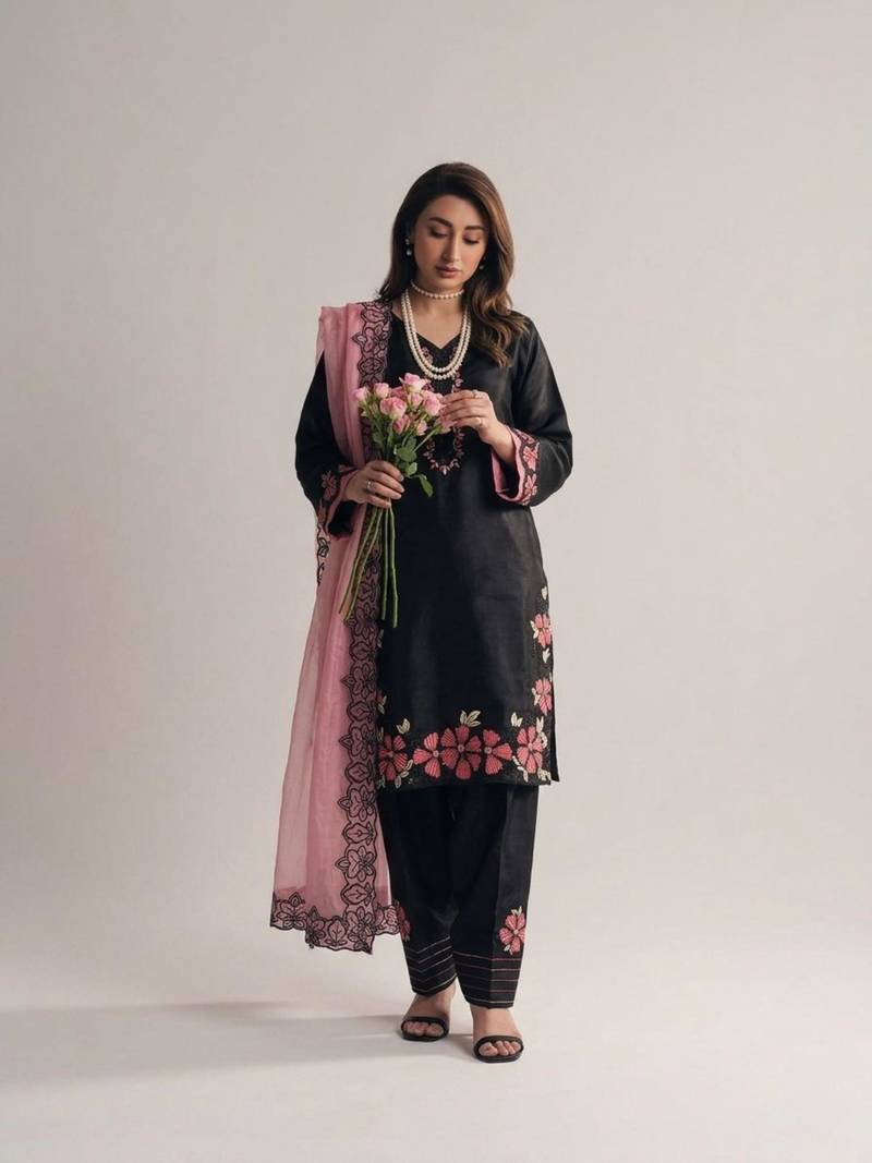 | Product Description | Captivate The Room In This Black Silk Blend Suit Featuring Vibrant Amethyst Pink Floral Embroidery. The Straight Kurta And Tapered Trousers Are Detailed With Intricate Threadwork, Perfectly Complemented By A Lilac Organza Dupatta With Scalloped Edges. This Luxurious Three Piece Set Is A Masterclass In Contrasting Colors And Traditional |