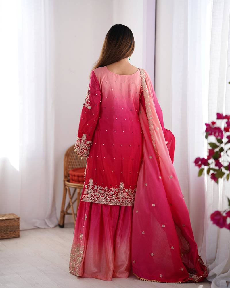 | Product Description | Embrace Bold Femininity With This Vibrant Fuchsia Pink Silk Suit. The Ombre Kurta Showcases Exquisite Floral Embroidery And Sequin Work, Paired With A Matching Tiered Sharara For A Regal Silhouette. This High Quality Set Includes A Soft Dupatta With Scalloped Borders, Ensuring You Stand Out At Every High Profile Event Or Festive Gathering. |