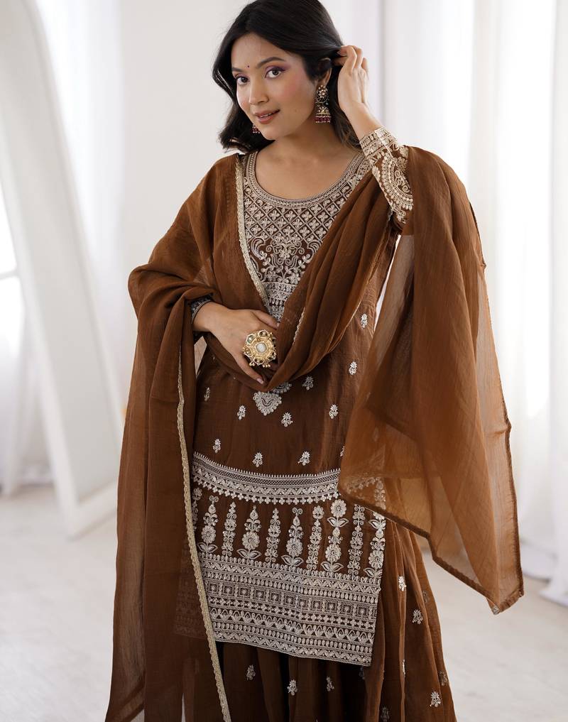 | Product Description | Stylish Brown Sharara Suit With Intricate Embroidery And Matching Dupatta. Perfect For Festive Celebrations, Wedding Events, And Cultural Occasions. The Rich Tone Adds A Classy Traditional Charm. |