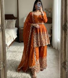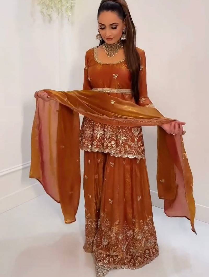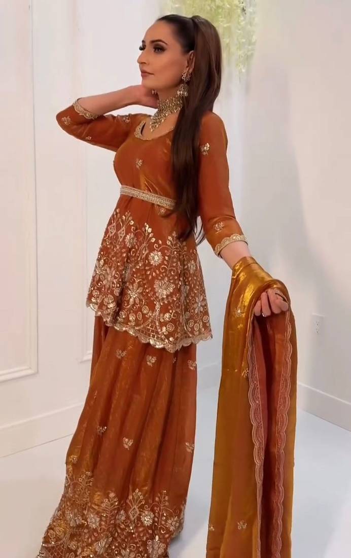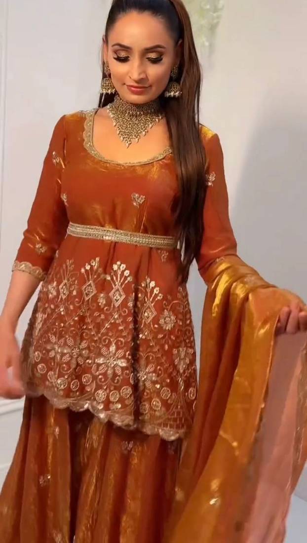 | Product Description | Indulge In The Plush Luxury Of This Burnt Orange Velvet Sharara. The Short Tunic Is Heavily Embellished With Traditional Gold Motifs And Sequin Work, Paired With Matching Flared Trousers. A Sheer Organza Dupatta Adds A Light Touch To The Rich Fabric, Creating A Balanced, High Fashion Look For Winter Weddings. |