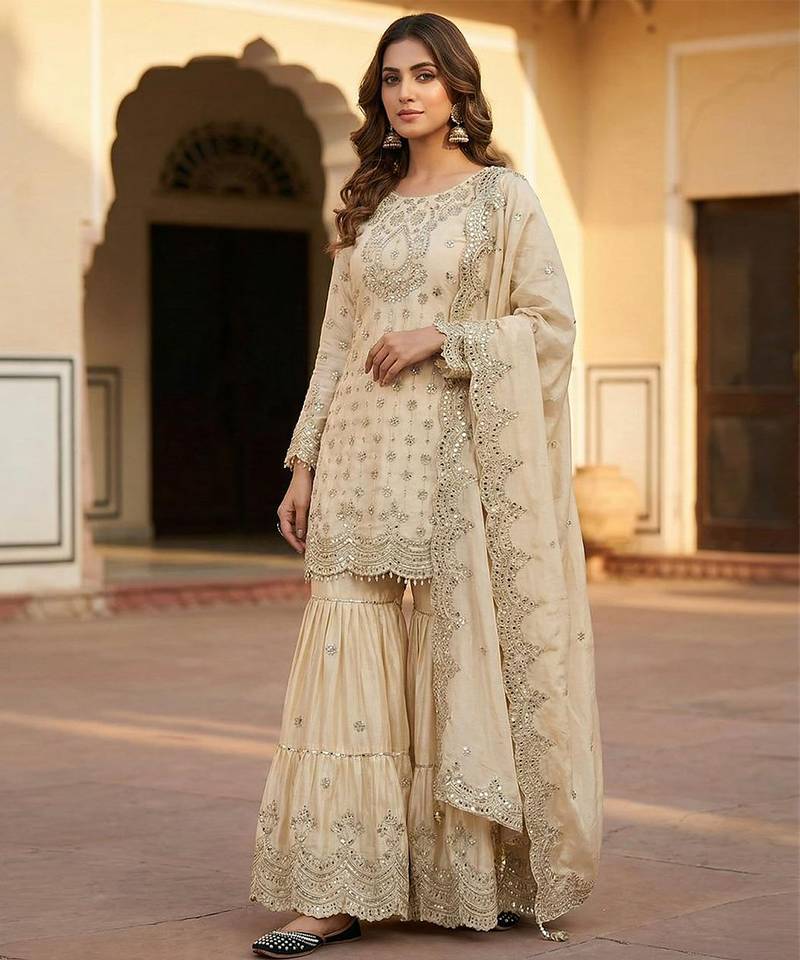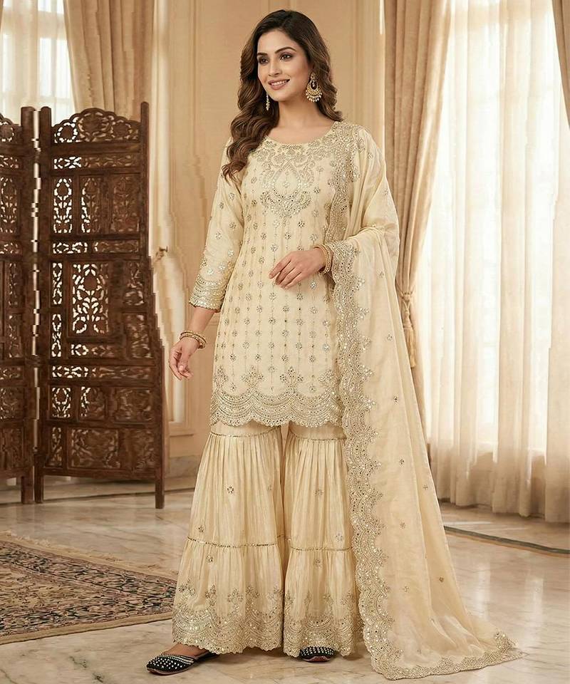 | Product Name | Chinon Ivory Mirror Work Sharara Suit | |