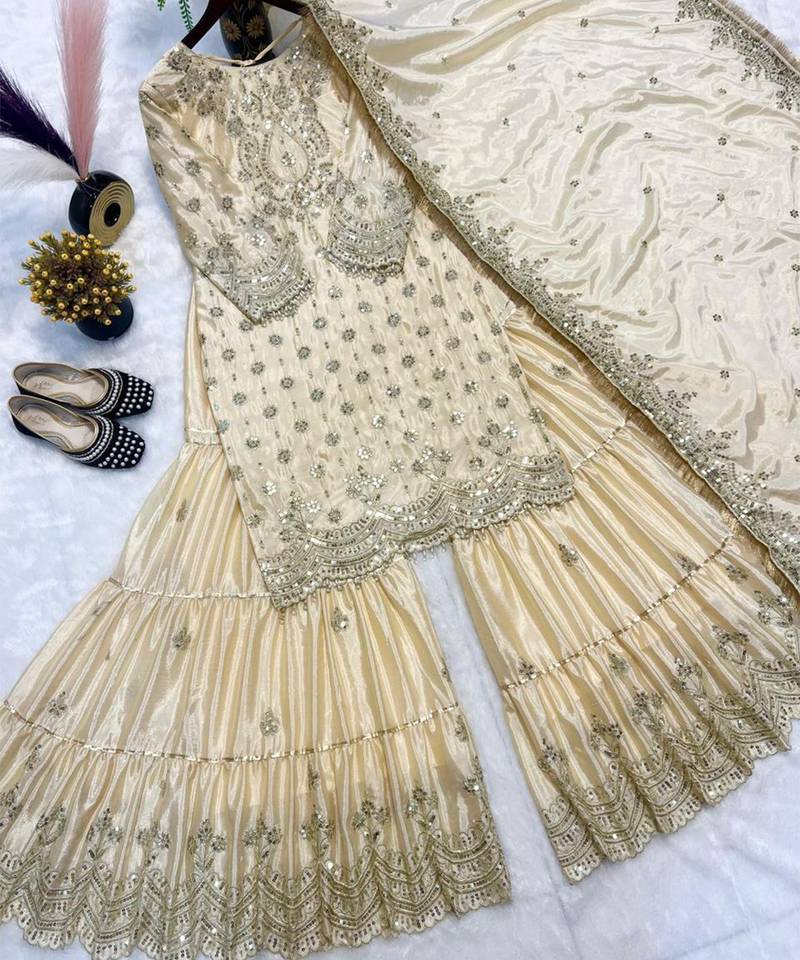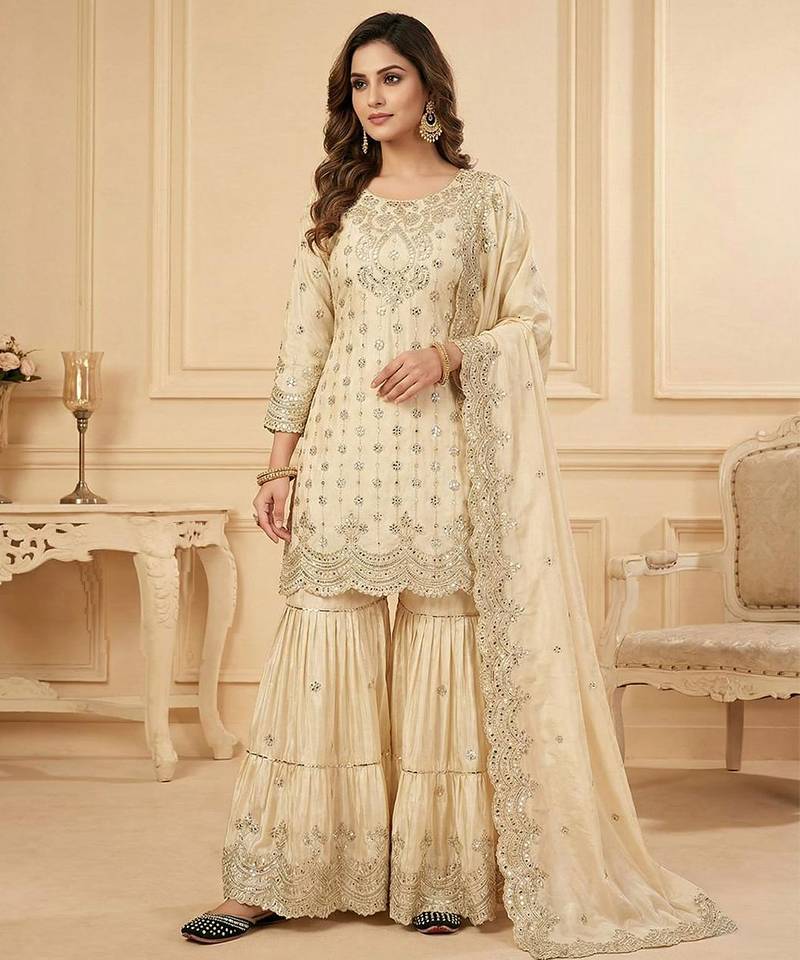 Chinon ivory mirror-work sharara suit stitched