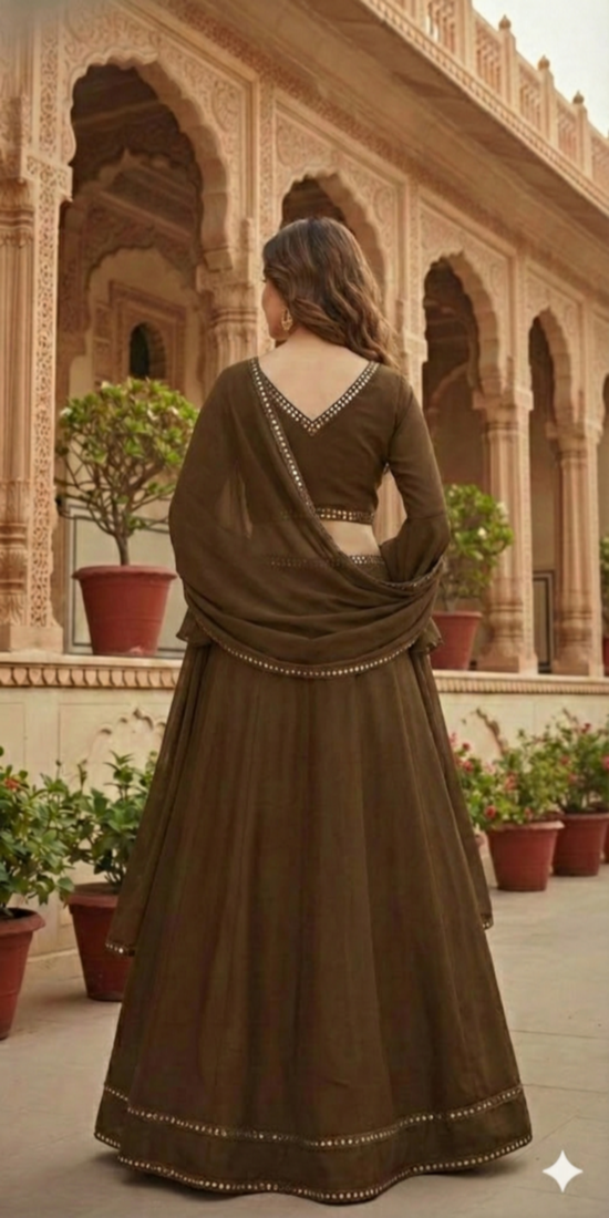 | Product Description | This Chocolate Brown Lehenga Set Includes A V Neck Blouse, Flared Skirt, And Matching Dupatta With Delicate Mirror Style Accents. The Soft Fabric Drapes Beautifully, Creating A Refined Festive Look. Perfect For Receptions, Parties, And Cultural Celebrations With A Rich, Elegant Finish. |