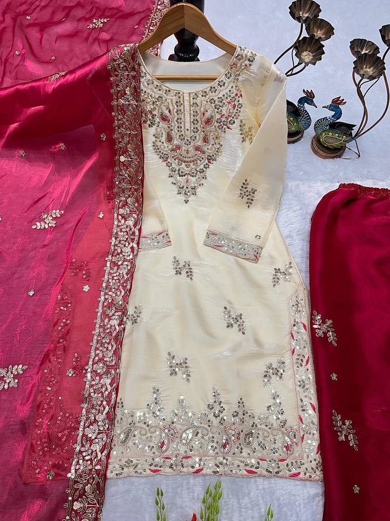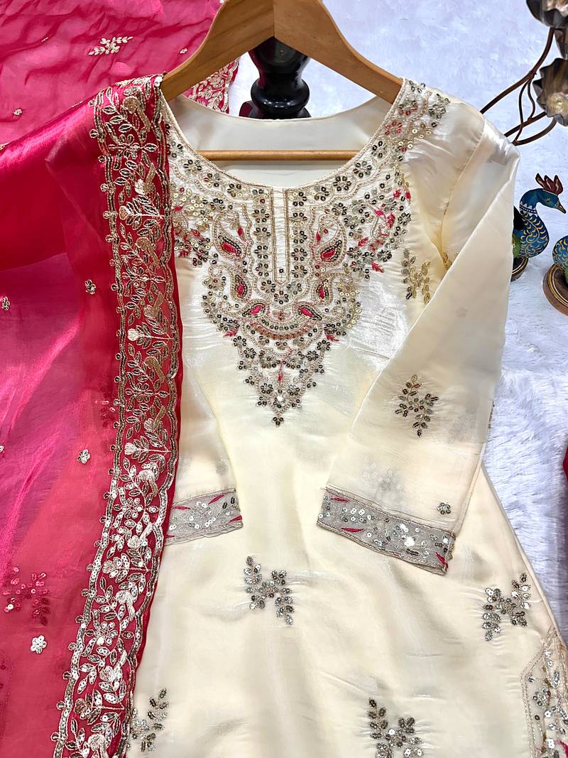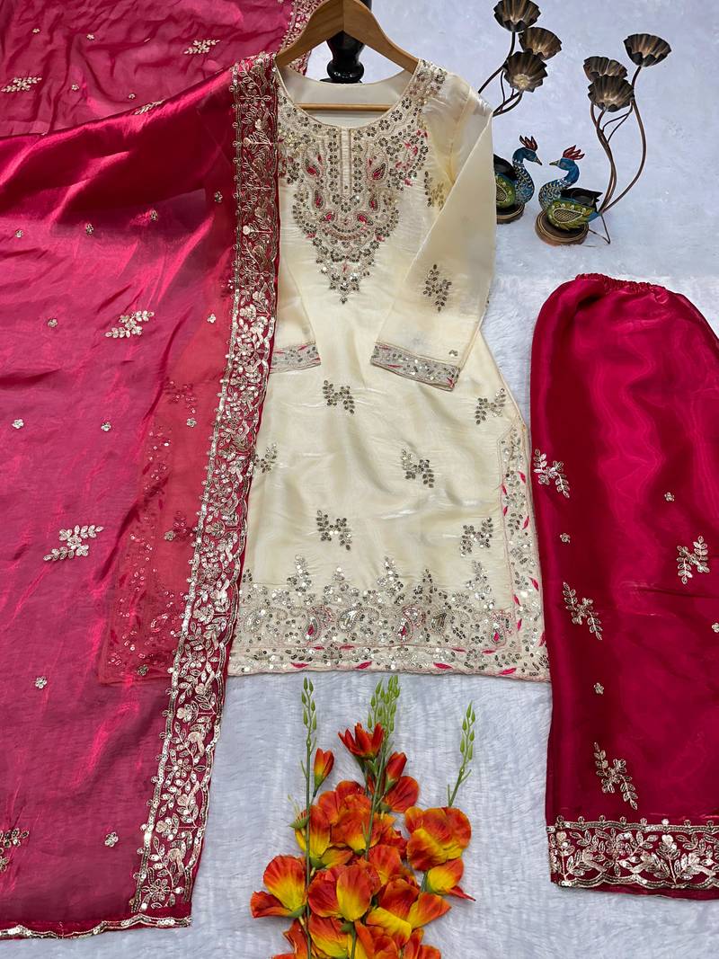 Cream kameez with rani pink palazzo embroidered suit stitched
