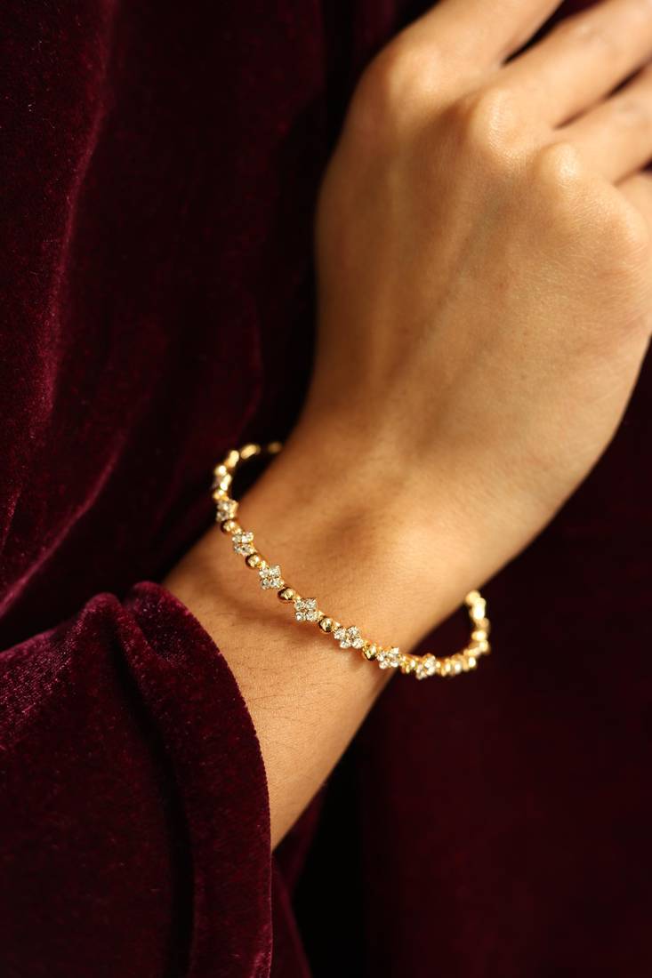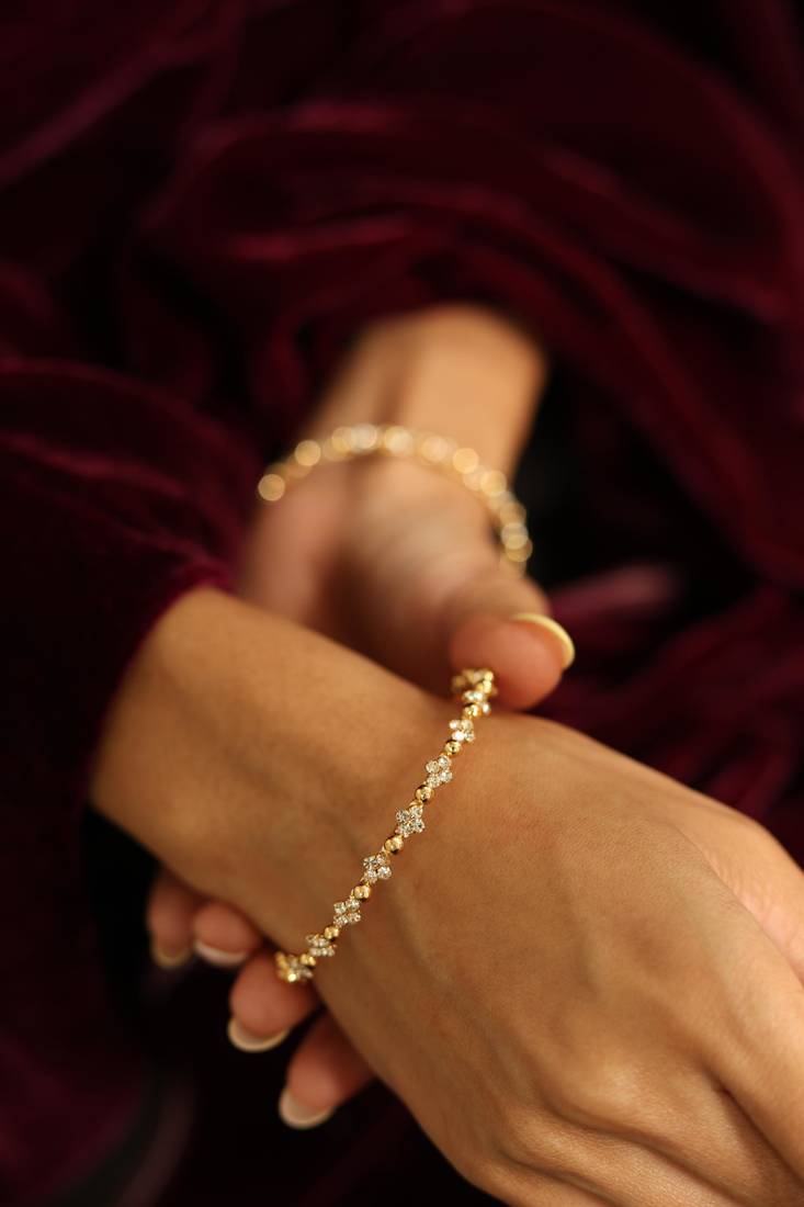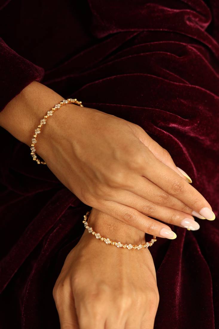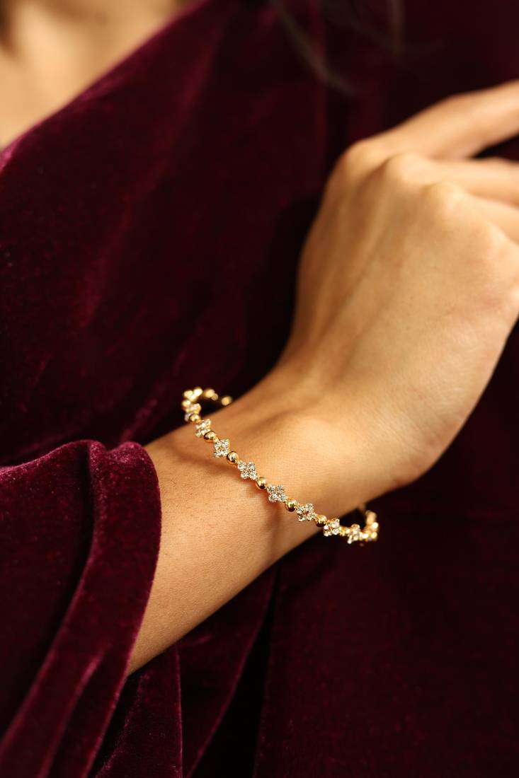 | Product Description | Shine Bright With This Dainty Diamond Floral Bangle. Featuring A Series Of Shimmering, Star Shaped Clusters Set In Warm Yellow Gold, This Piece Blends Classic Elegance With Modern Minimalism. It Is An Ideal Gift For Anniversaries Or Milestones, Offering A Sophisticated Sparkle That Gracefully Transitions From Desk To Dinner. |