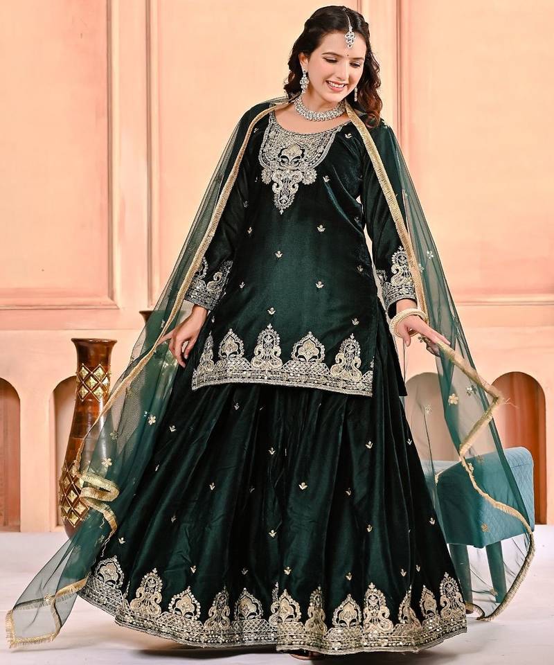 | Product Description | Dark Emerald Exude Royalty In Our Velvet Sharara Set. The Plush Velvet Set Is Richly Embroidered With Threads And Sequins, Creating A Beautiful Designer Set. Paired With A Matching Flared Sharara And Gold Bordered Dupatta, This Party Outfit Offers Warmth Without Compromising On Luxury And Style. |
