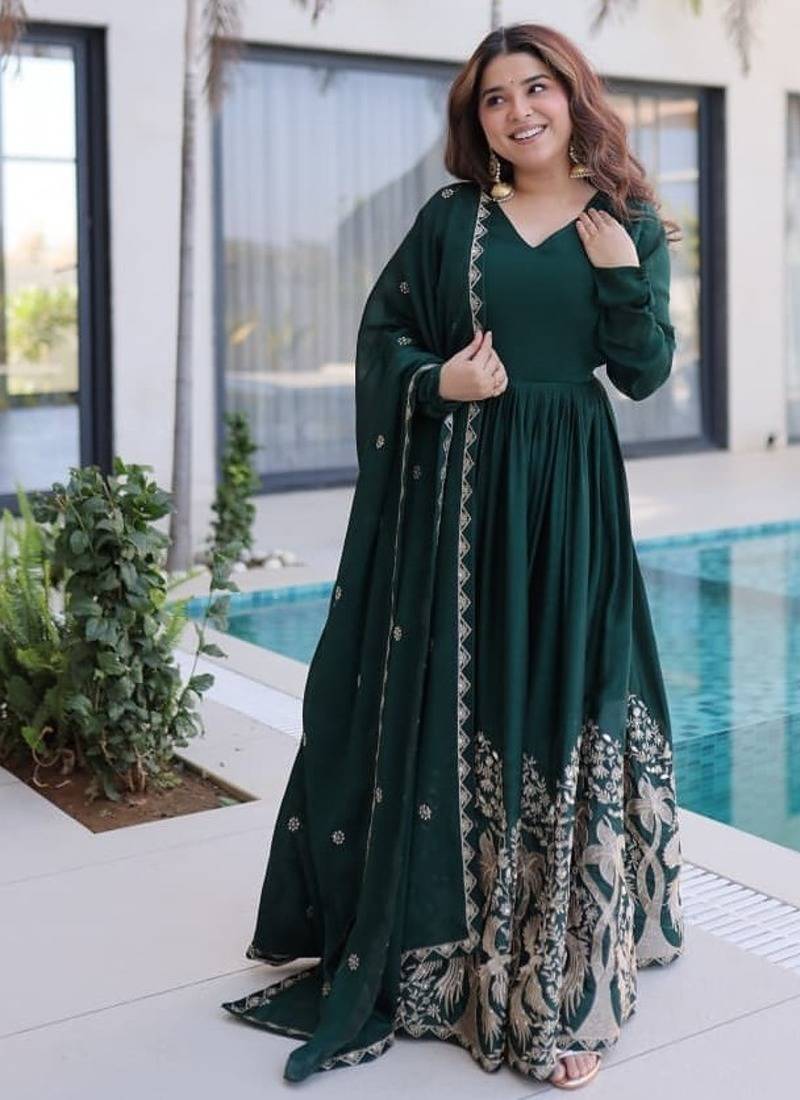 | Product Description | This Dark Green Anarkali Gown Features Beautiful Embroidery Along The Hem And A Flowing Flare That Enhances Its Elegant Appeal. The Matching Dupatta Completes The Traditional Look, Making It Perfect For Festive Celebrations, Weddings, And Evening Events. A Graceful Outfit That Blends Rich Color With Timeless Ethnic Style. |