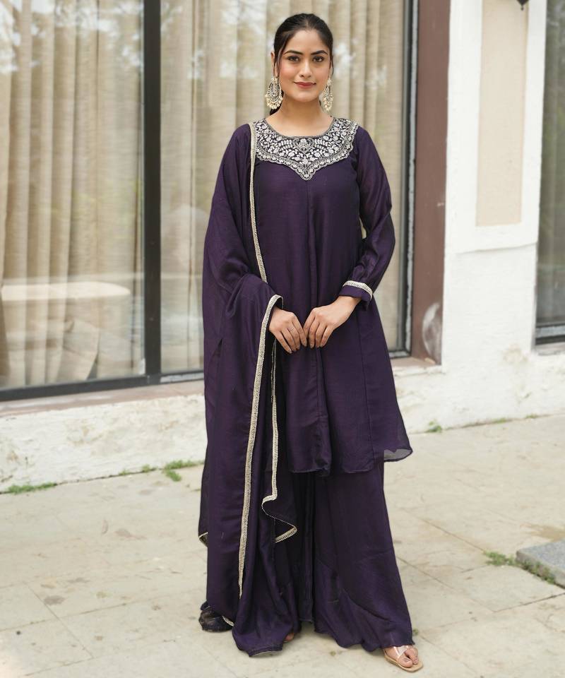 | Product Description | This Dark Purple Suit Features Intricate Neckline Embroidery With A Matching Dupatta And Comfortable Fit. Crafted From Premium Fabric, It Ensures Elegance And Ease Of Wear. Ideal For Festive Occasions And Evening Events, This Outfit Offers A Rich Color With Refined Detailing. |
