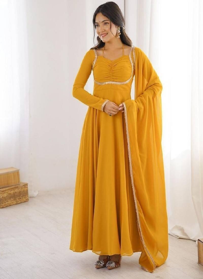 | Product Description | This Deep Yellow Anarkali Gown Features A Fitted Bodice And Voluminous Flare For A Graceful Silhouette. Finished With Delicate Border Accents And A Matching Dupatta, It’s Perfect For Festive Occasions, Wedding Functions, And Evening Celebrations. |
