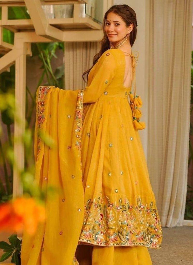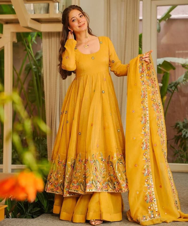 Dark yellow embroidered anarkali set stitched