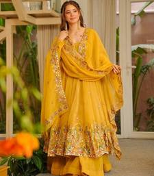 | Product Description | Brighten Your Festive Wardrobe With This Breathtaking Mustard Yellow Anarkali Set. Crafted From Lightweight, Premium Organza, The Floor Length Kurta Features Stunning Multi Colored Floral Threadwork And Delicate Sequin Accents Along The Hem. Complete With A Matching Embroidered Dupatta And Flowing Skirt, This Ensemble Offers A Regal Silhouette Perfect For Weddings And Cultural Celebrations. |