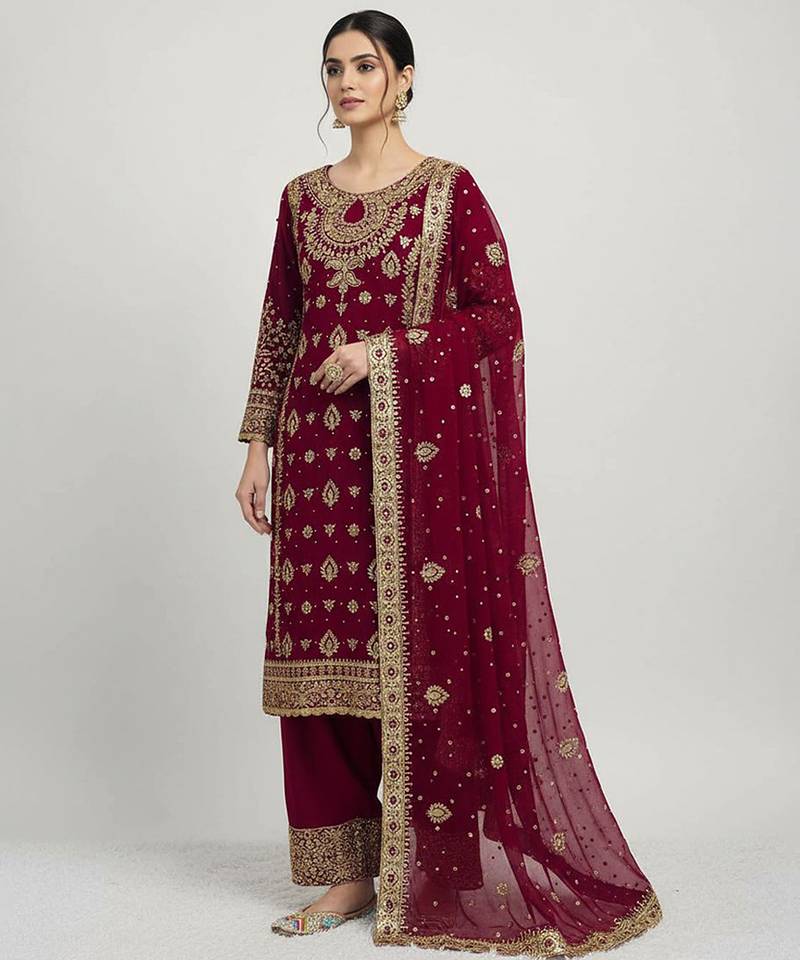 Deep maroon sequins work suit stitched