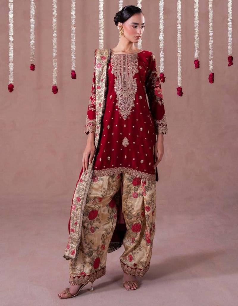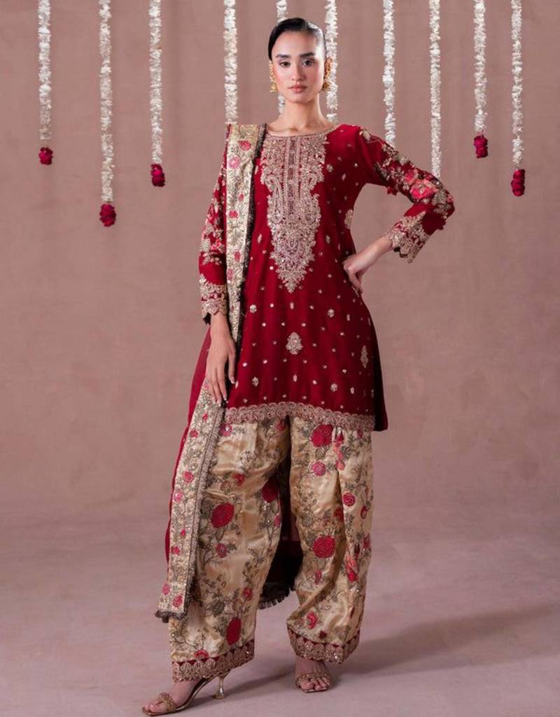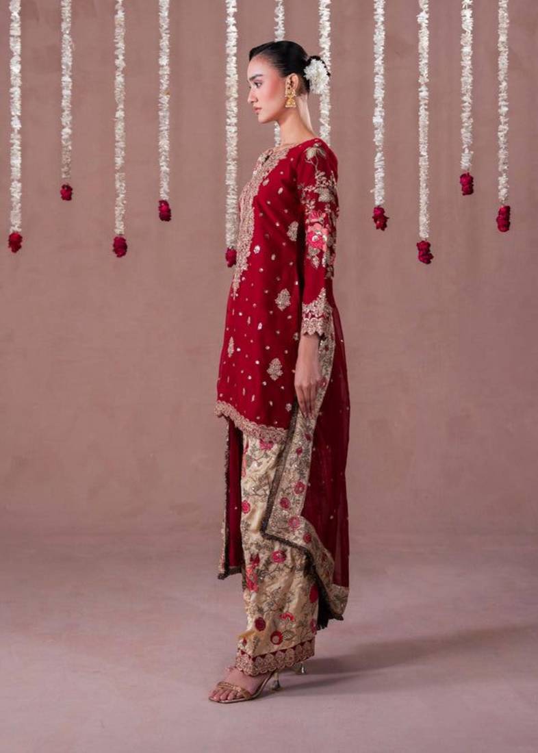 | Product Description | Command Attention In This Luxurious Deep Maroon Velvet Kurta, Adorned With Dense Gold Zari And Sequin Embroidery. The Opulent Top Is Paired With Contrasting Beige Brocade Trousers Featuring Vibrant Rose Pink Floral Motifs. This Majestic Ensemble Provides A Rich, Regal Aesthetic, Specifically Designed For Grand Winter Weddings And Formal Celebratory Occasions. |