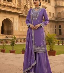 | Product Description | Step Into Luxury With This Electric Purple Silk Blend Palazzo Set. The Long Tunic Features Elaborate Gold Hand Embroidery On The Neckline And Sleeve Cuffs. Complemented By Flared Sharara Pants With Matching Gold Borders And A Rich Silk Dupatta, This Ensemble Is Designed For Those Who Appreciate Bold Colors And Fine Craftsmanship. |