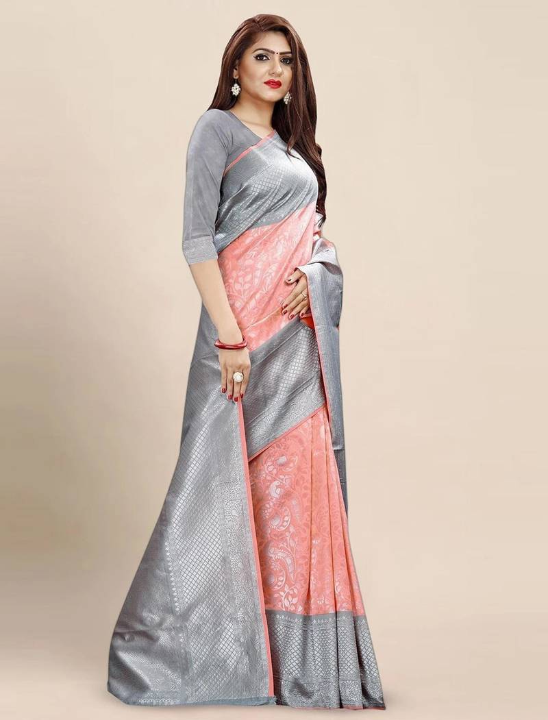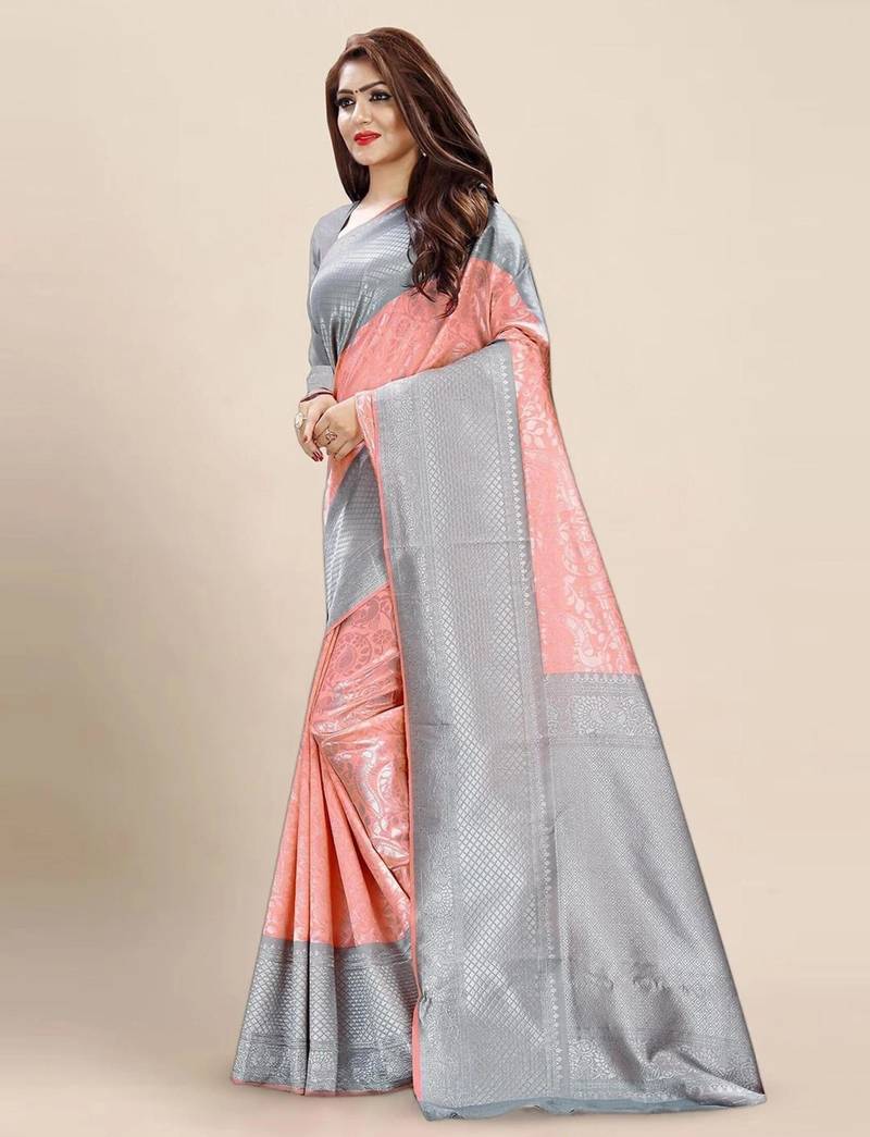 | Product Name | Elegant Peach And Silver Grey Silk Blend Saree | |