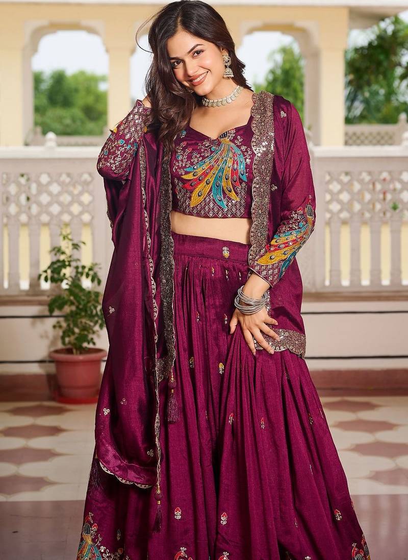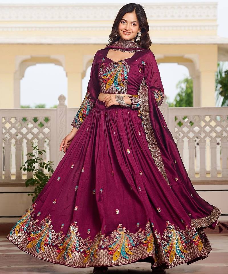 Capture The Spotlight With This Wine Purple Lehenga Set. The Highlight Is The Striking Peacock Motif, Intricately Embroidered With Multi Colored Threads And Sequins. With A Broad Border Skirt And A Matching Scalloped Dupatta, This Ensemble Offers A Regal Charm That Is Truly Unforgettable For Any Traditional Indian Ceremony. Free Size Upto 44