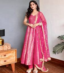 | Product Description | Celebrate Heritage With This Fuchsia Pink Anarkali Gown Crafted From Rich Banarasi Silk. The Fabric Features A Delicate Gold Floral Weave That Catches The Light Beautifully. Finished With A Sequin Embellished Net Dupatta And Gold Lace Borders, This Outfit Is A Masterpiece Of Indian Textile Artistry And Feminine Grace. |