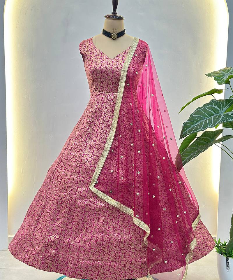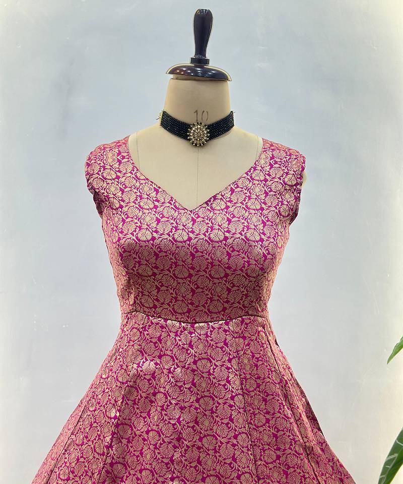 Fuchsia pink banarasi gown set stitched