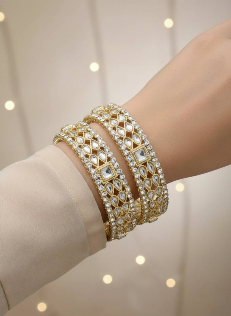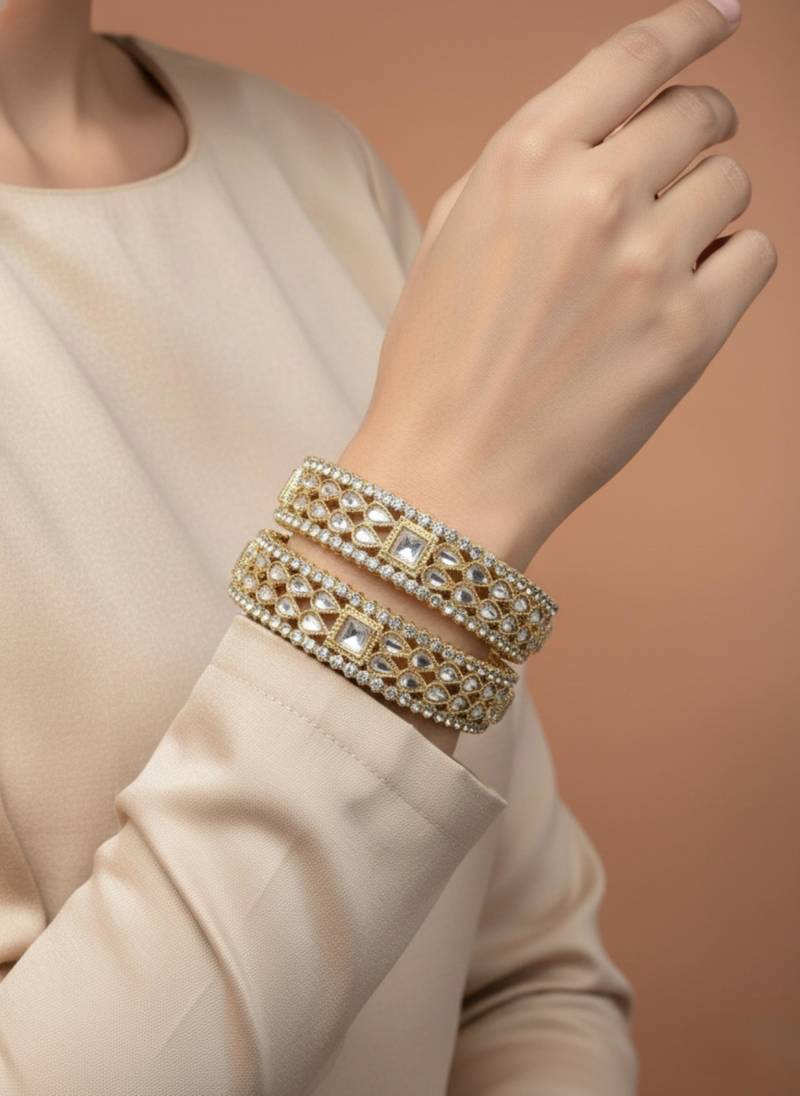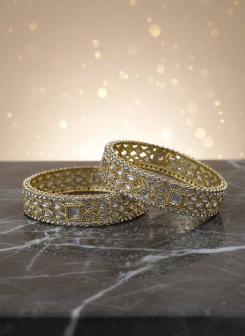 | Product Description | Enhance Your Ethnic Ensemble With These Exquisite Gold Plated Bangles, Featuring A Unique Scalloped Silhouette. Adorned With Precision Cut Kundan Stones And Delicate Beadwork, These Handcrafted Pieces Blend Traditional Artistry With Modern Flair. Perfect For Weddings Or Festive Celebrations, They Offer A Regal Touch To Any Sophisticated Jewelry Collection. |