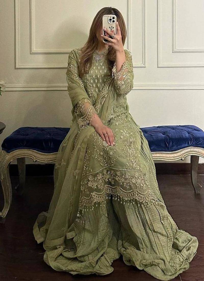 Captivate The Room In This Pastel Green Palazzo Set. Crafted From Premium Net Fabric, It Features Delicate Silver Floral Vines And Shimmer Sequins Throughout. The Tiered Sharara And Scalloped Edge Dupatta Create An Ethereal, Romantic Silhouette. This Designer Piece Is A Favorite For Bridesmaids Seeking A Light Yet Opulent Festive Look.