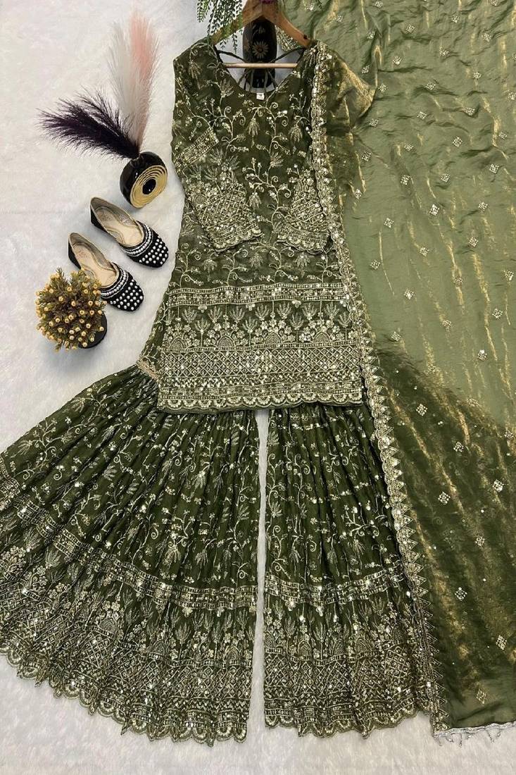 Sophisticated Green Sharara Suit Featuring Detailed Embroidery And Traditional Motifs. The Beautifully Designed Kurta Pairs With A Flared Sharara And Elegant Dupatta. Ideal For Weddings, Festive Gatherings, And Cultural Celebrations. High Quality Fabric And Intricate Craftsmanship Create A Timeless Ethnic Ensemble With Graceful Style And Modern Elegance.
