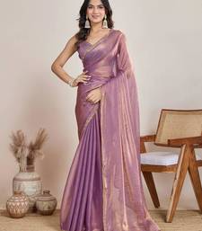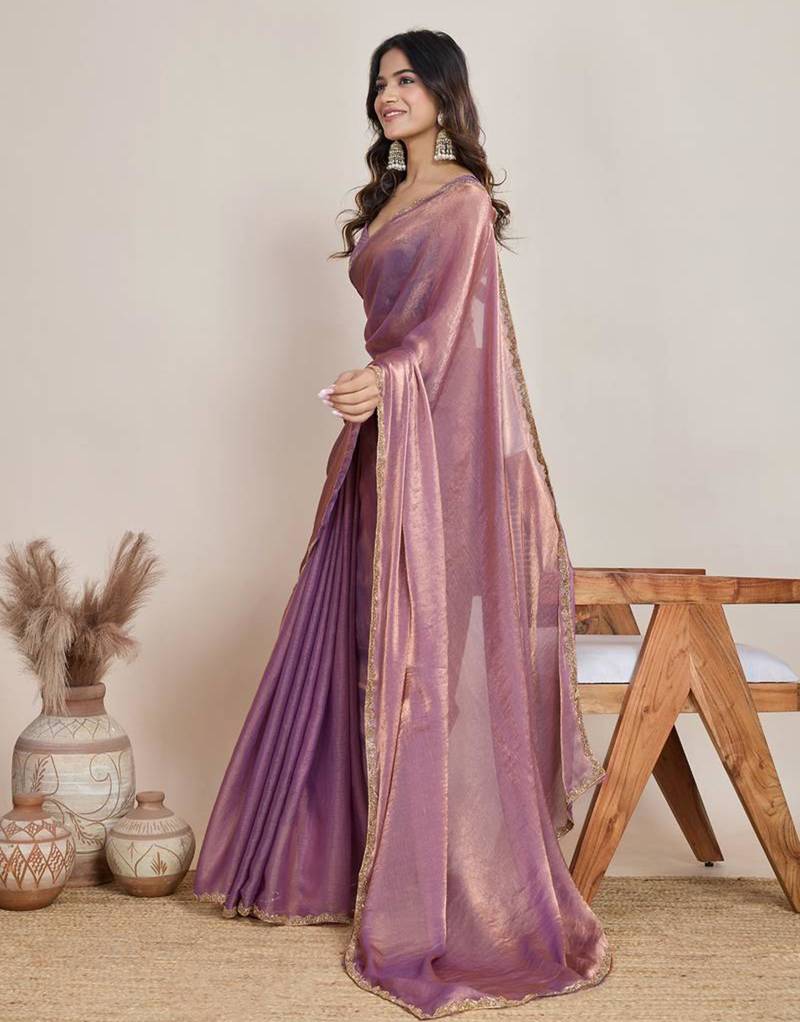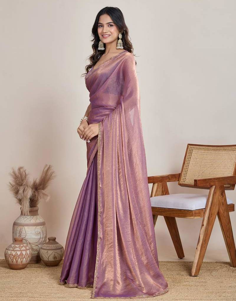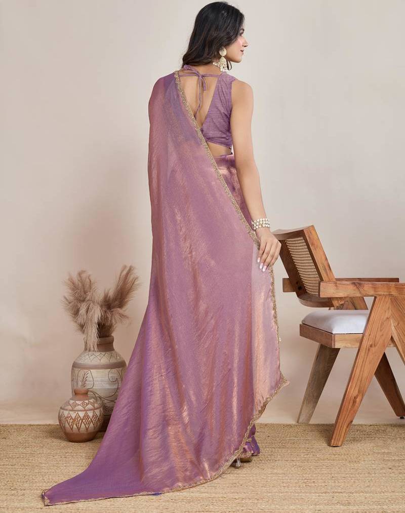 | Product Description | Radiate Modern Femininity In This Lavender Chffon Saree. The Sheer Fabric Features A Subtle Shimmer And Is Accented By An Exquisite Gold Scalloped Lace Border. This Trendy, Lightweight Ensemble Is A Top Pick For Bridesmaids Or Summer Soirées, Providing A Breezy Yet Glamorous Look That Is Effortlessly Chic. |
