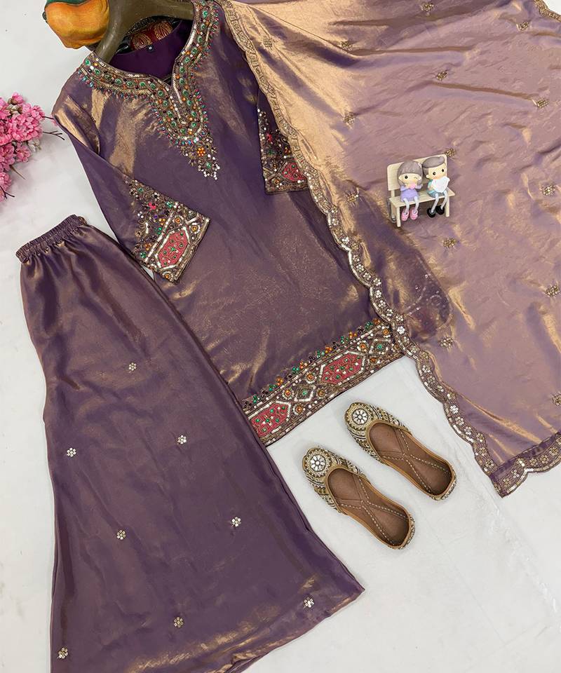 Lavender metallic organza blend sharara set stitched