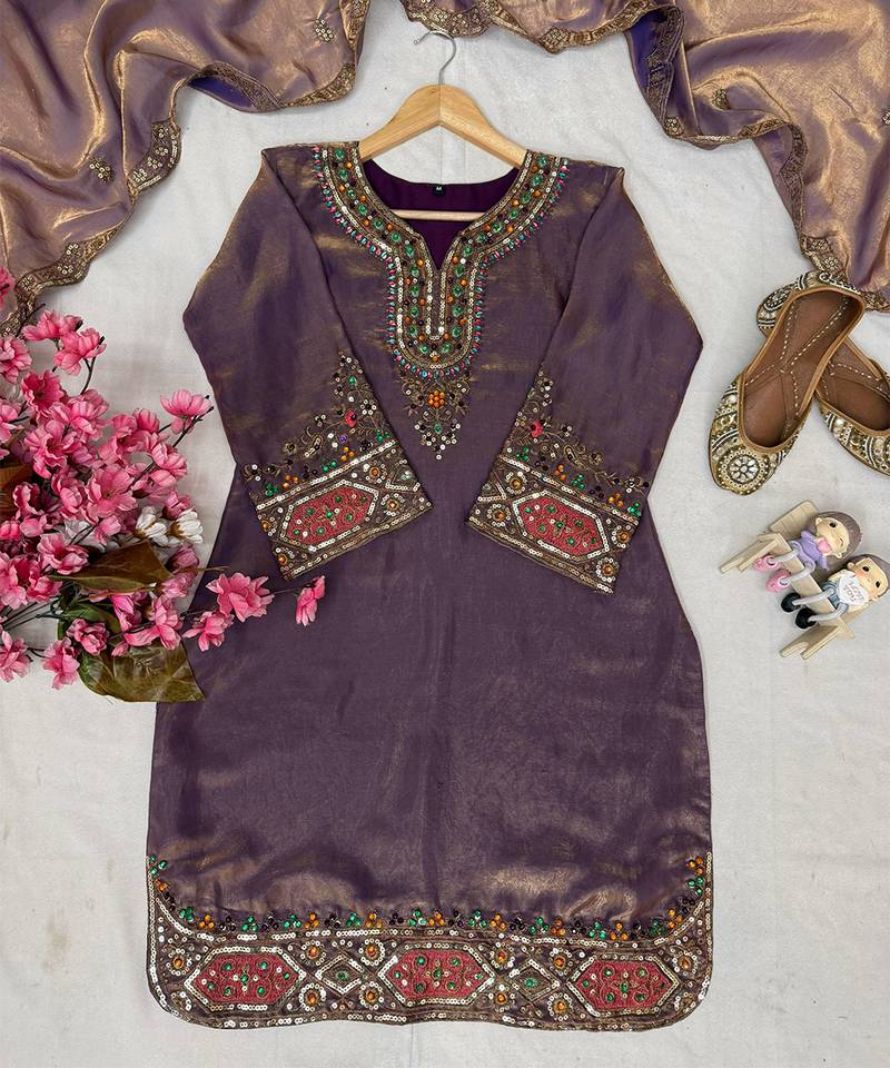 | • | Dupatta | : | Color- Purple / Fabric- Silk Blend |