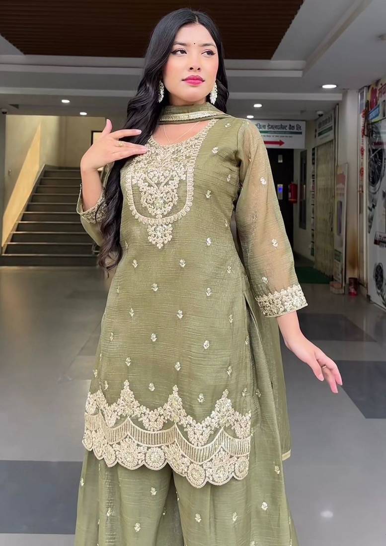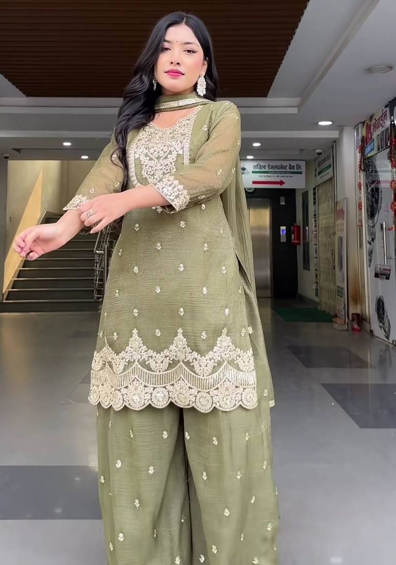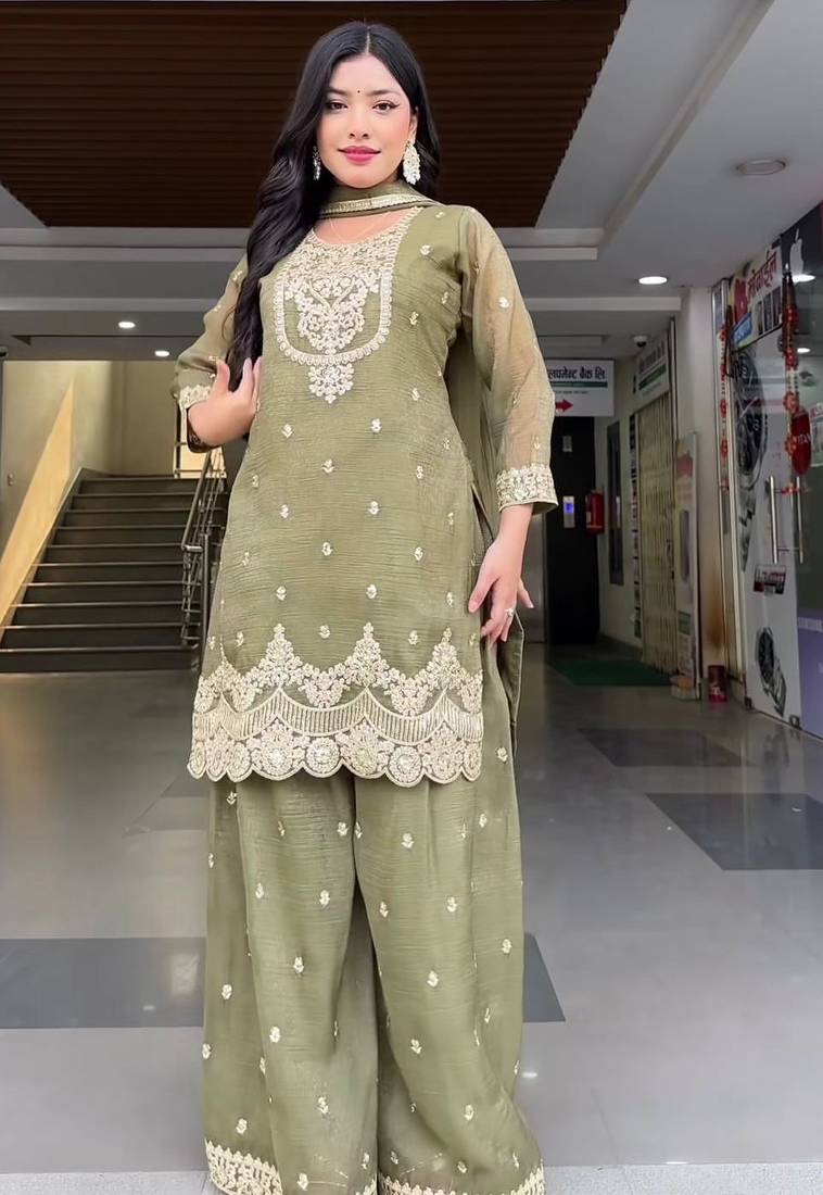 | Product Description | Step Out In Style With This Unique Light Olive Green Silk Blend Sharara Set. The Semi Sheer Sleeves And Bodice Are Adorned With Fine Silver Embroidery And Shimmering Accents. This Ensemble Balances Heritage With A Modern Palette, Offering A Sophisticated Look That Transitions Seamlessly From Festive Afternoon Events To Evening Celebrations. |