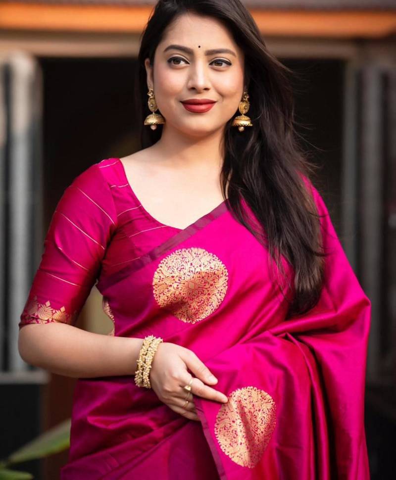 | Product Description | Stand Out Effortlessly In This Vibrant Magenta Pink Silk Blend Saree. Decorated With Striking, Oversized Gold Circular Woven Motifs And A Rich, Heavily Detailed Gold Border, This Eye Catching Piece Perfectly Balances Modern Flair With Traditional Craftsmanship. An Ideal Ensemble For Festive Parties And Bridal Events. |