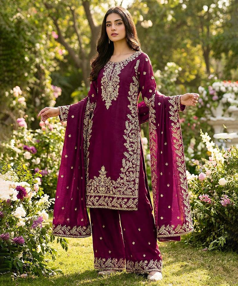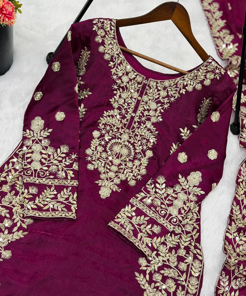 Magenta silk embroidered salwar suit stitched