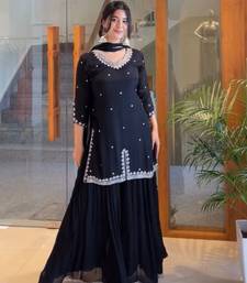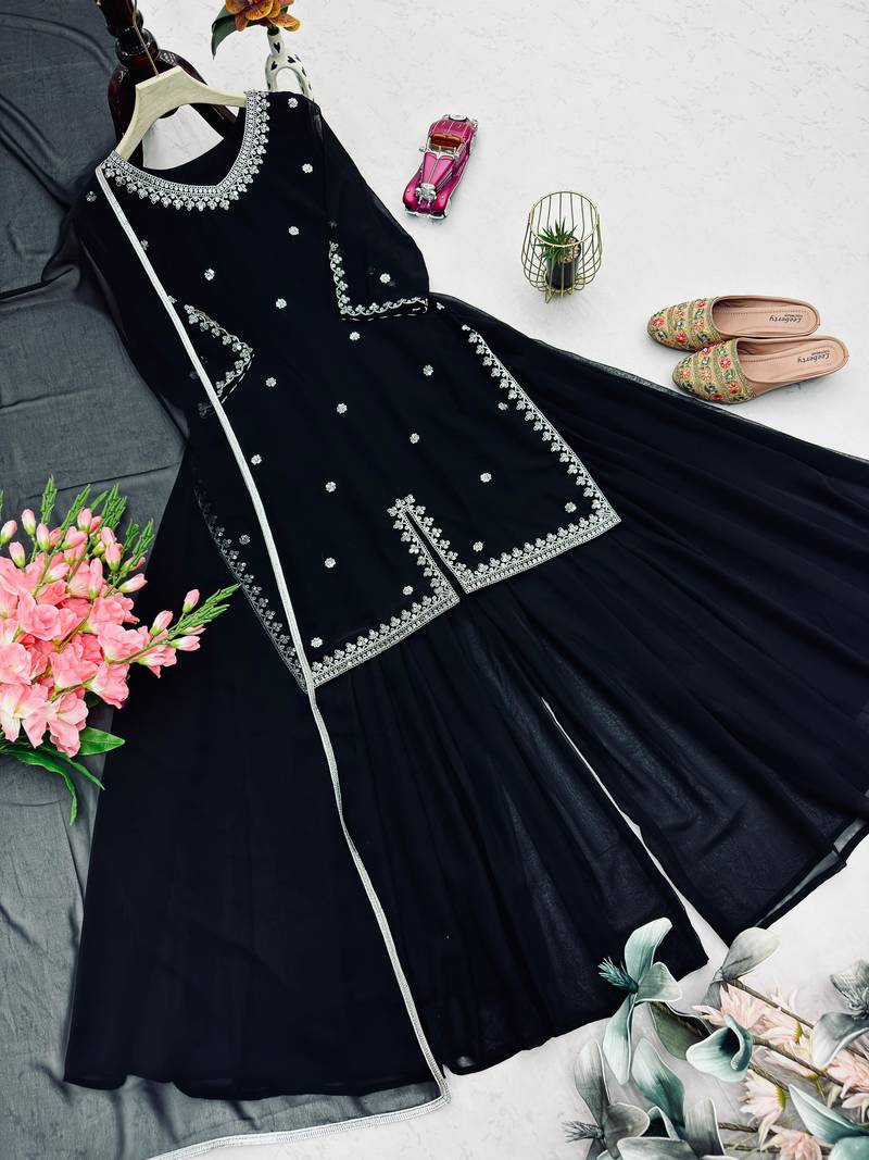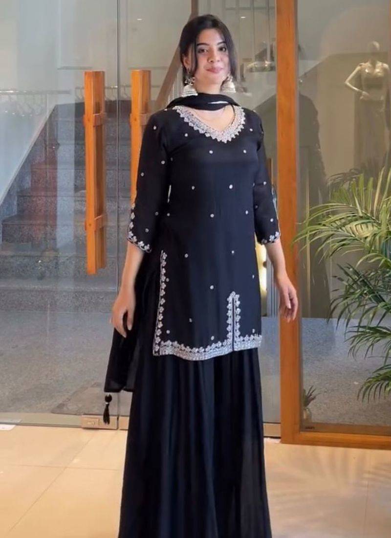 | Product Description | Capture The Spotlight In This Sophisticated Midnight Black Georgette Palazzo Set. The Tunic Is Beautifully Accented With Silver Zari Embroidery On The Neckline And Hem. Paired With Flowing, Layered Sharara Bottoms And A Delicate Silver Bordered Dupatta, This Monochromatic Look Is The Epitome Of Evening Elegance And Timeless Style. |