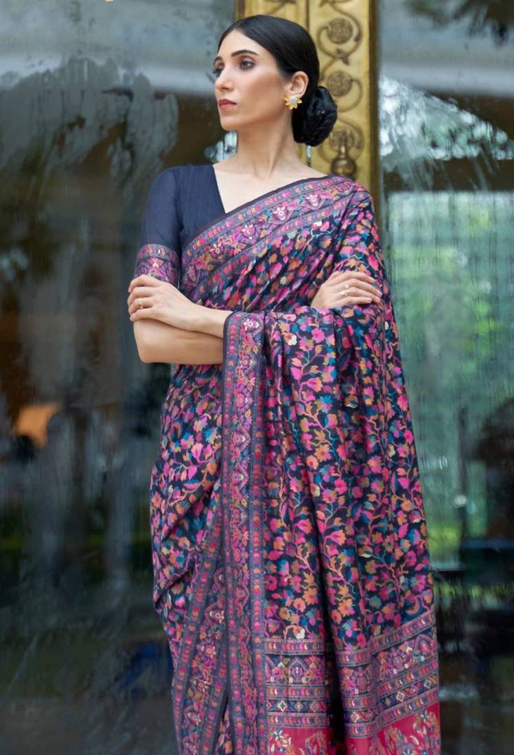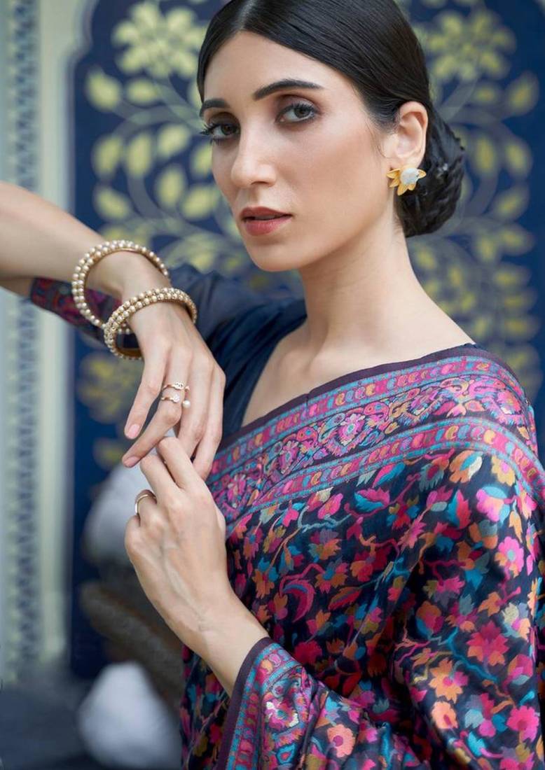 Midnight blue pashmina silk blend saree