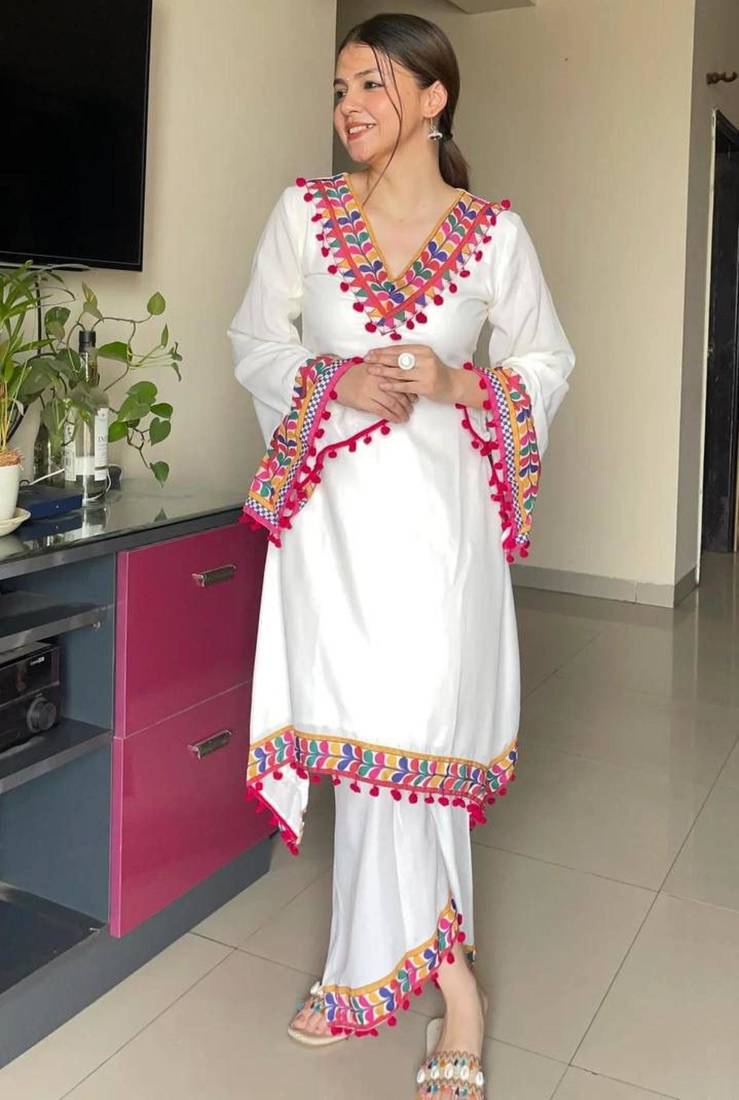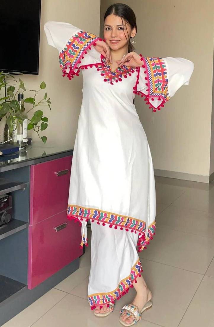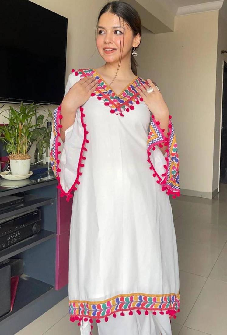 | Product Name | Modern White Kaftan Style Tunic With Vibrant Geometric Border And Pom Poms | |