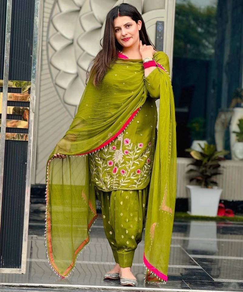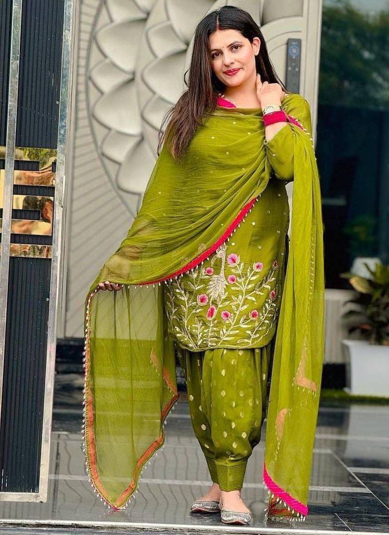 Moss green patiala salwar suit with floral threadwork and pink accents stitched