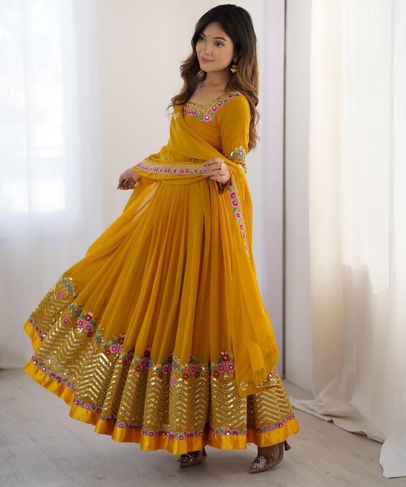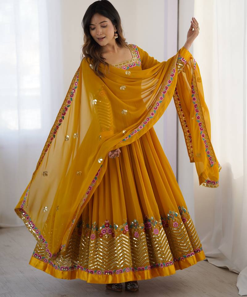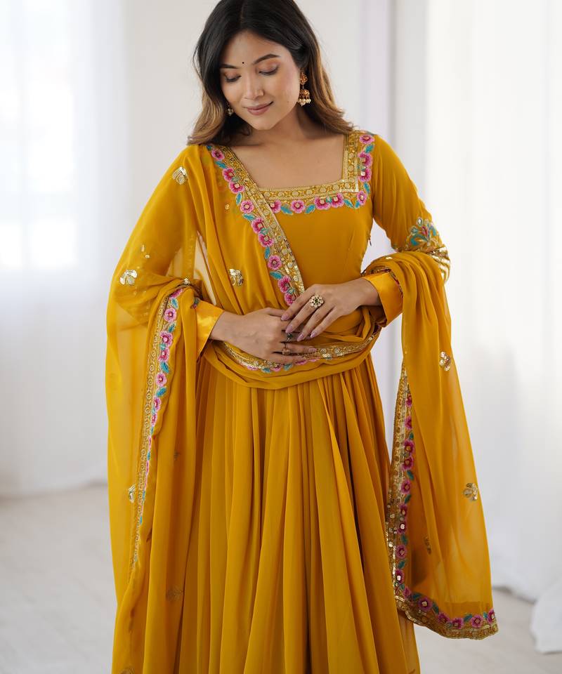 Mustard georgette anarkali suit set with embroidery stitched