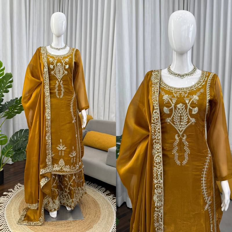 Mustard gold thread embroidered palazzo suit stitched